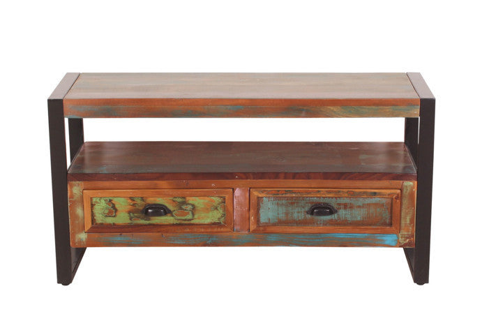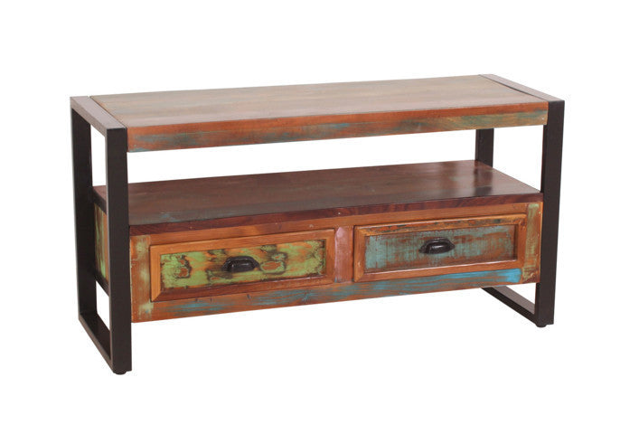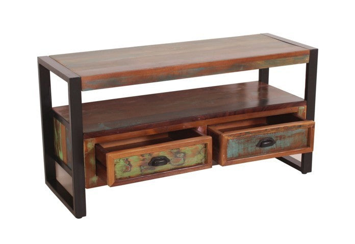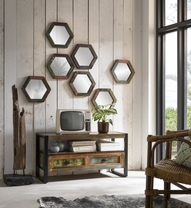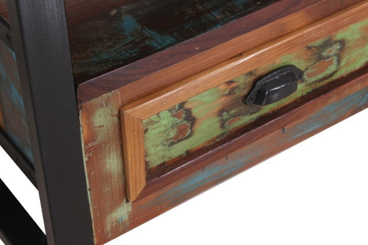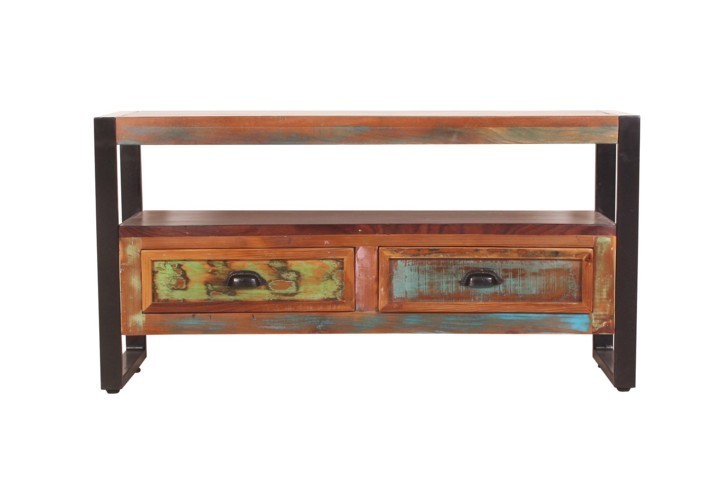 Mobili realizzati con legno riciclato trattato e recuperato per creare ambienti con uno stile industrial allegro e colorato.
