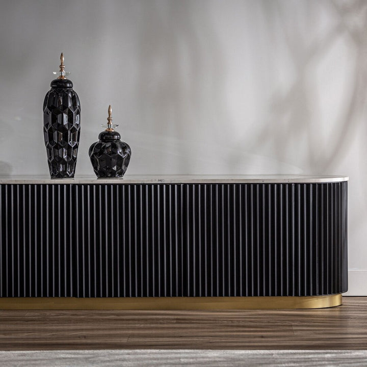 Un mobile porta TV in stile Art Déco dallo stile lussuoso e dal forte impatto visivo, ideale per ambienti eleganti e moderni. Realizzato in marmo nero abbinato a ferro bianco e legno MDF dorato, offre un sofisticato gioco di contrasti tra materiali e colori. Con un peso di 70,2 kg, è solido e funzionale, perfetto per organizzare la zona TV aggiungendo un tocco di esclusività all’ambiente. Lavorato artigianalmente, ogni esemplare presenta naturali variazioni di colore e dettagli unici che valorizzano la qualità dei materiali. Ideale per living di pregio e spazi dallo stile raffinato e ricercato.