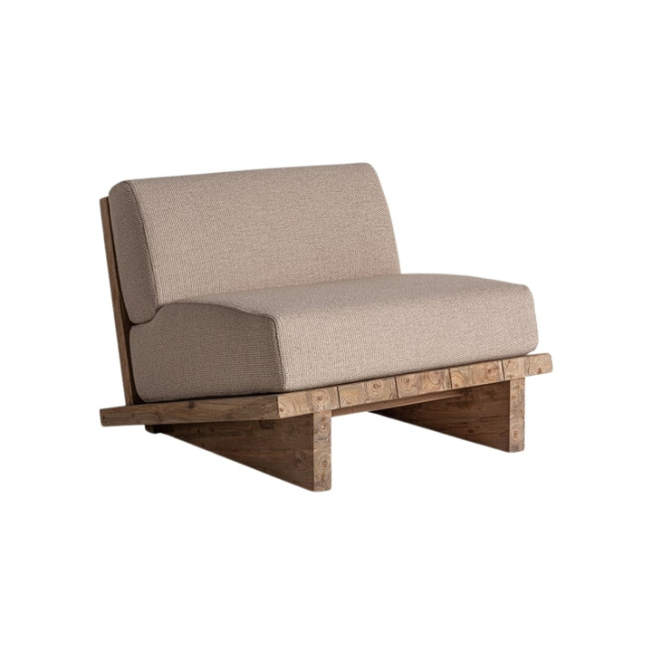 Un invito al relax e alla contemplazione, questa poltrona dal design essenziale e organico unisce forma e funzione in un equilibrio raffinato. Realizzata in legno di recupero con finitura naturale marrone, si distingue per la struttura inclinata e le linee pulite che trasmettono stabilità e leggerezza visiva. La seduta è rivestita in polipropilene riciclato beige con imbottitura in schiuma, per offrire comfort e rispetto per l’ambiente. Il tessuto è idrorepellente, adatto anche a spazi semi-esterni. Un complemento di arredo ideale per interni in stile contemporaneo, naturale o minimalista, in cui materia e concetto si fondono per abitare il presente con eleganza e coerenza.