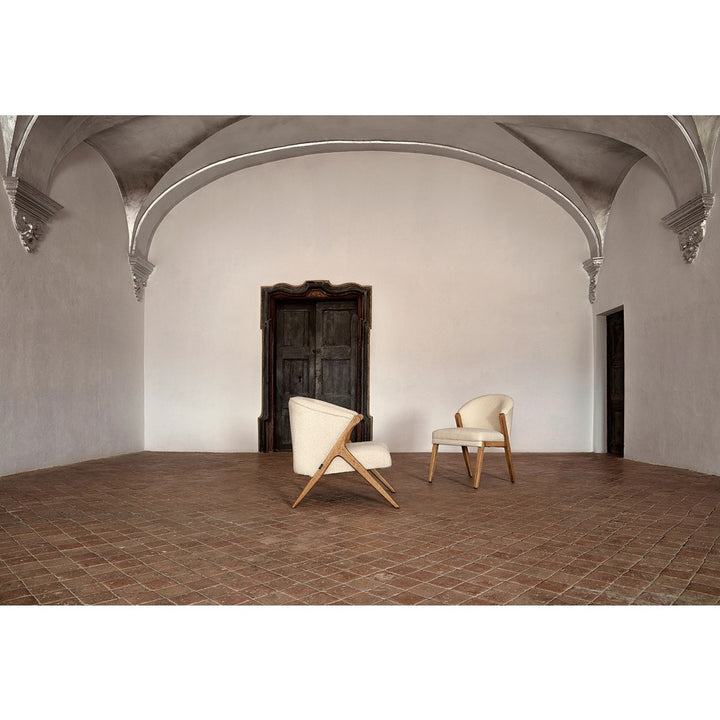 NOTE: Legno di pino bianco sporco, rivestimento in cotone bouclé, lavorazione artigianale, prodotto non sfoderabile, variazioni naturali di tono e forma.