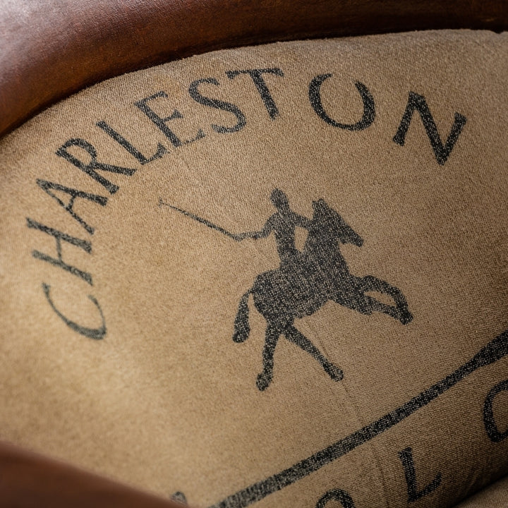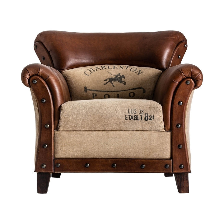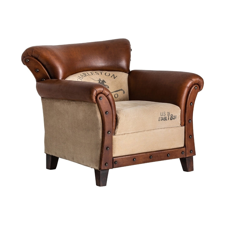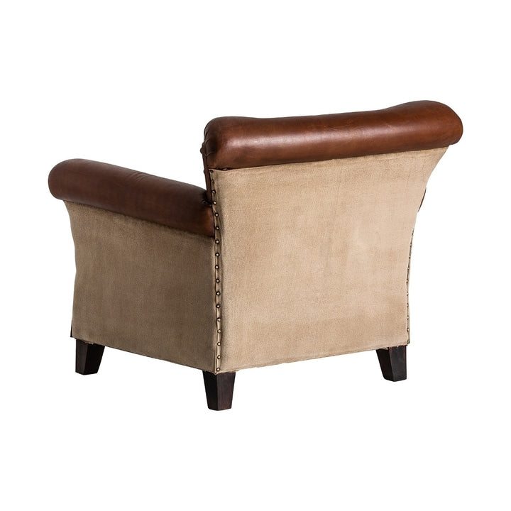 POLTRONA LIVERPOOL, COLORE CIOCCOLATO, STILE VINTAGE. REALIZZATO IN LEGNO DI MANGO, ABBINATO A COTONE E PELLE.