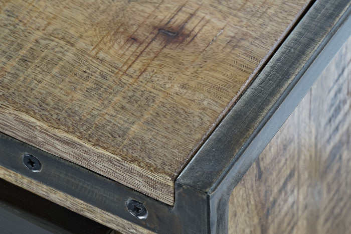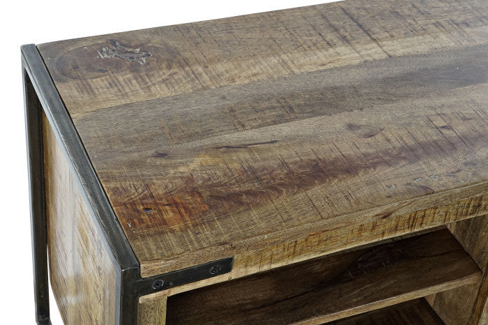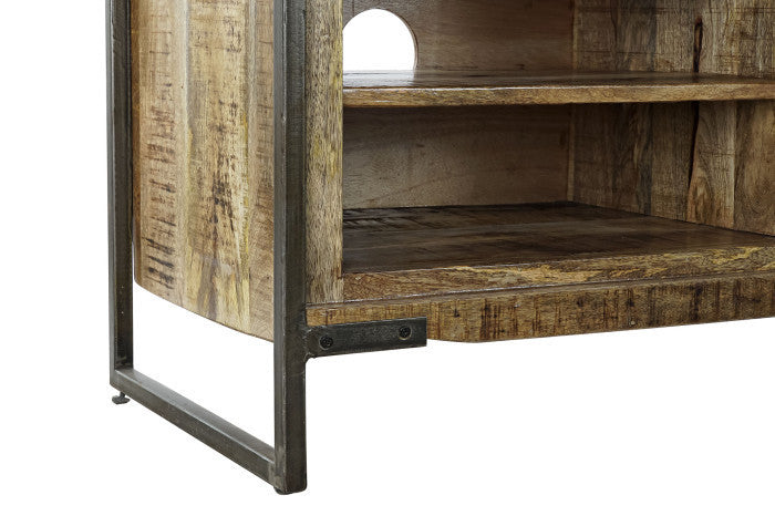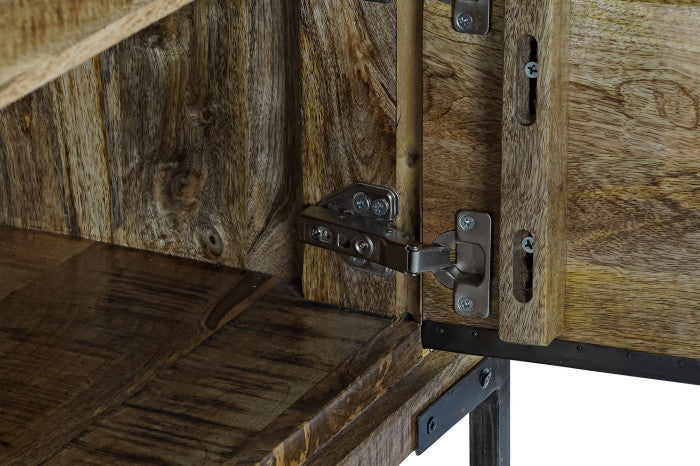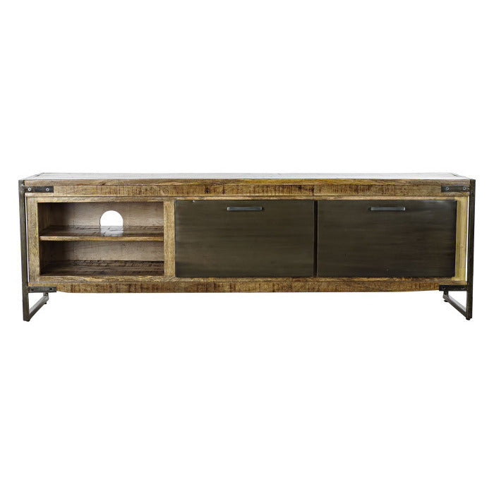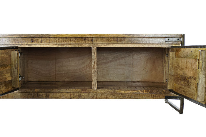 Porta TV in stile industrial chic, realizzato in acciaio e legno massello di mango. Questo mobile rappresenta la perfetta fusione tra materiali robusti e naturali, offrendo sia resistenza che eleganza.