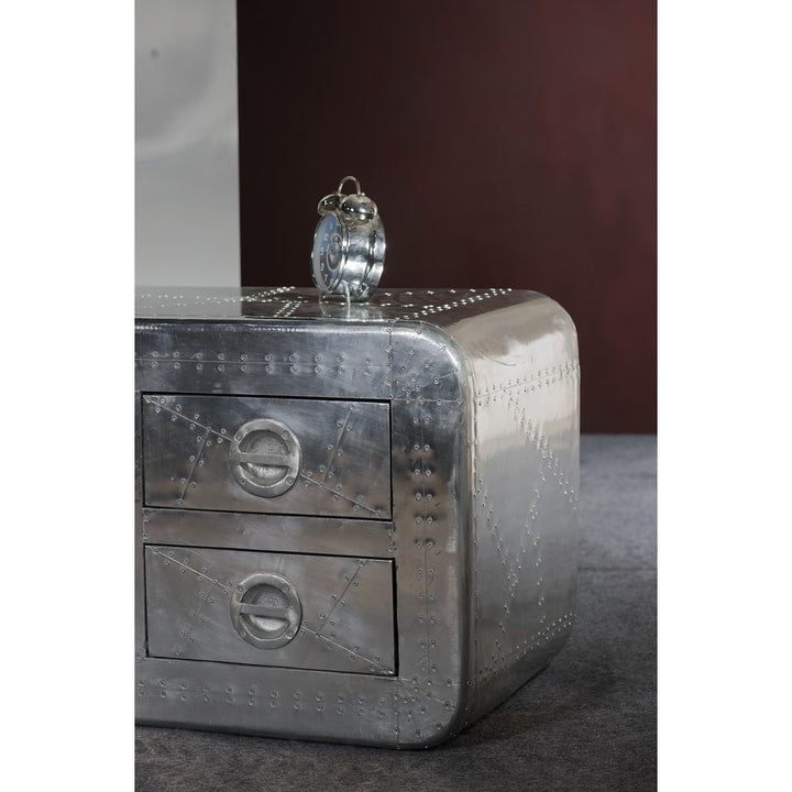 NOTE: 2 cassetti, 1 mensola, struttura in MDF rivestita in alluminio con viti decorative, peso 40 kg, finitura argento lucido.