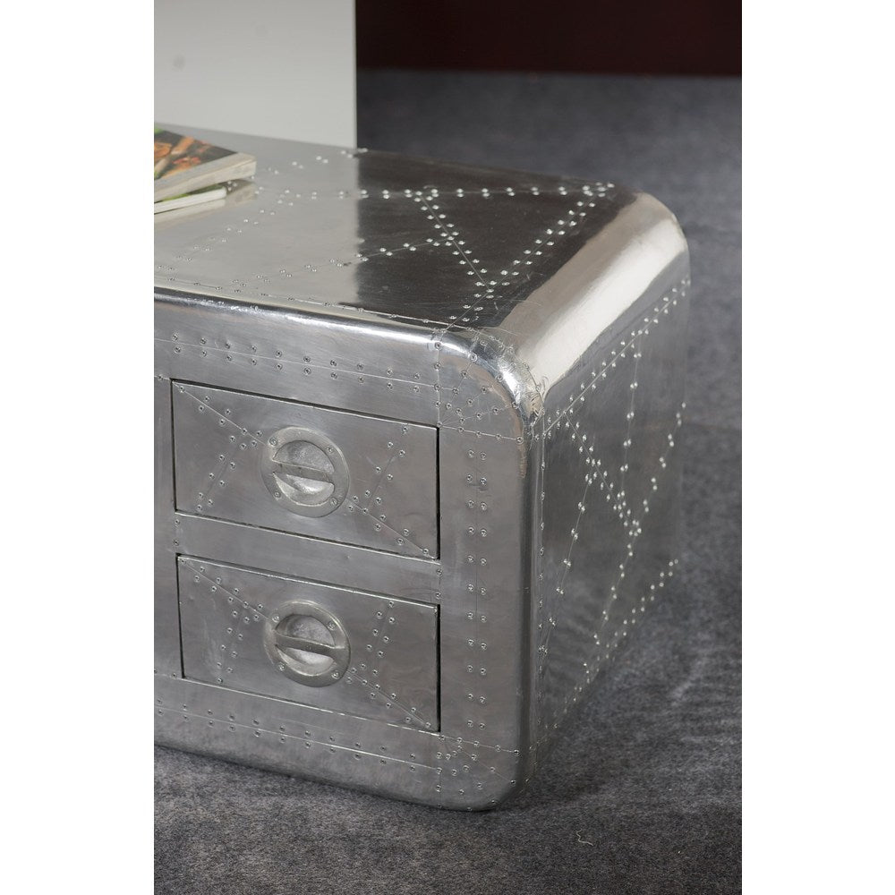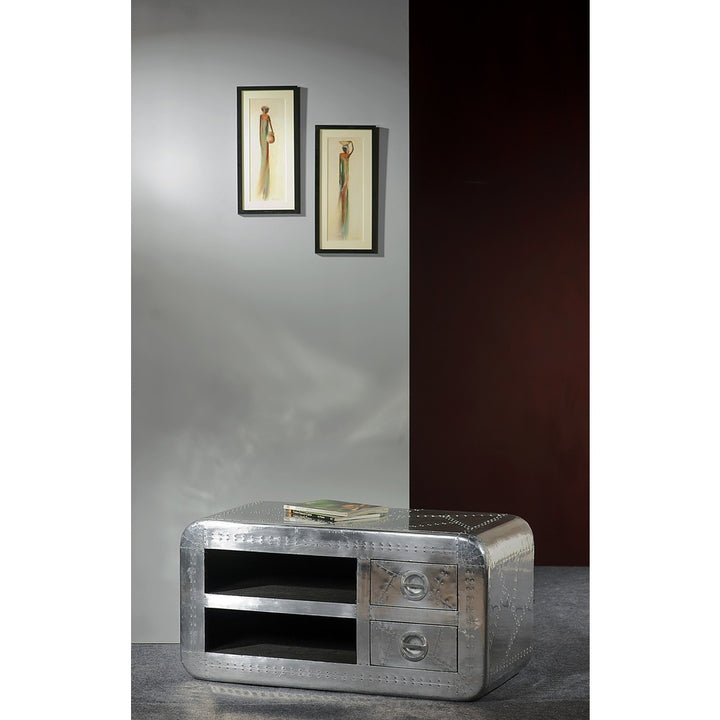 Lo stile vintage industrial incontra la modernità chic in questo straordinario porta TV basso, compatto e scenografico. Realizzato in legno di mango e MDF rivestito in alluminio, con viti decorative a vista, richiama le linee dei vecchi aerei d’officina e il fascino dei capannoni industriali. Con 2 cassetti e 1 mensola centrale, offre un pratico spazio per dispositivi multimediali e oggetti decorativi. L’effetto metallico argento crea un brillante contrasto con il legno, donando un tocco di design di lusso all’ambiente. Ideale per zone living moderne e loft industriali, si distingue per originalità e versatilità. Proposto con sconti fino al 70% su Ethnic Chic.