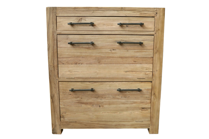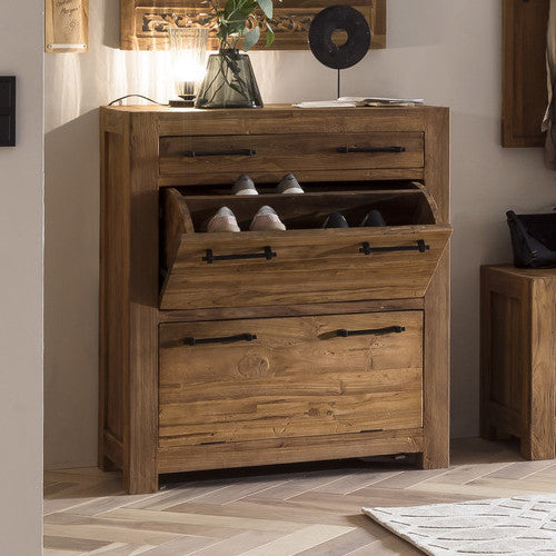 Mobili realizzati in teak stagionato recuperato da antiche case indonesiane, da tonalità naturali e la superficie spazzolata donano un fascino unico al mobile che lo distingue dal legno nuovo.