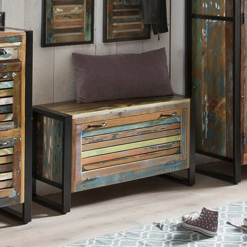 Mobili realizzati con legno riciclato trattato e recuperato per creare ambienti con uno stile industrial allegro e colorato.