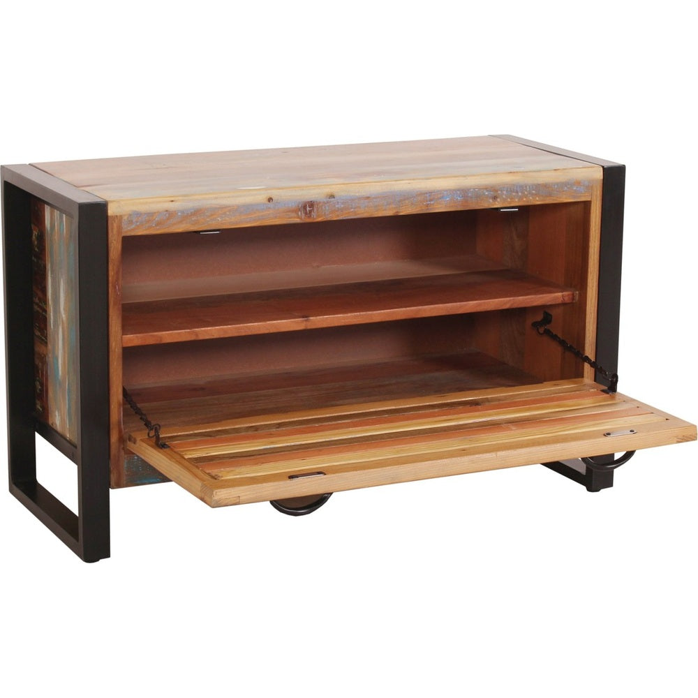 NOTE: Legno massello di recupero multicolor, struttura in ferro nero, dimensioni 85×35×50 cm, peso 25 kg, 1 anta e 2 ripiani, capacità circa 6 paia di scarpe. Ogni pezzo è unico, con variazioni di colore e finitura dovute alla lavorazione artigianale.