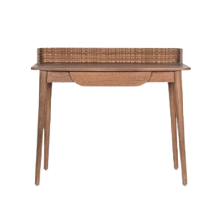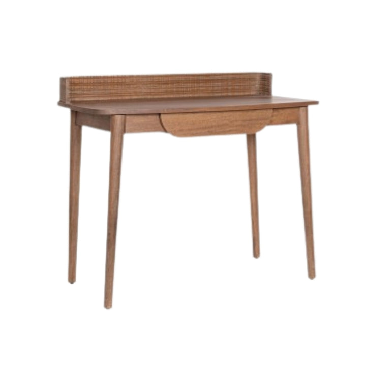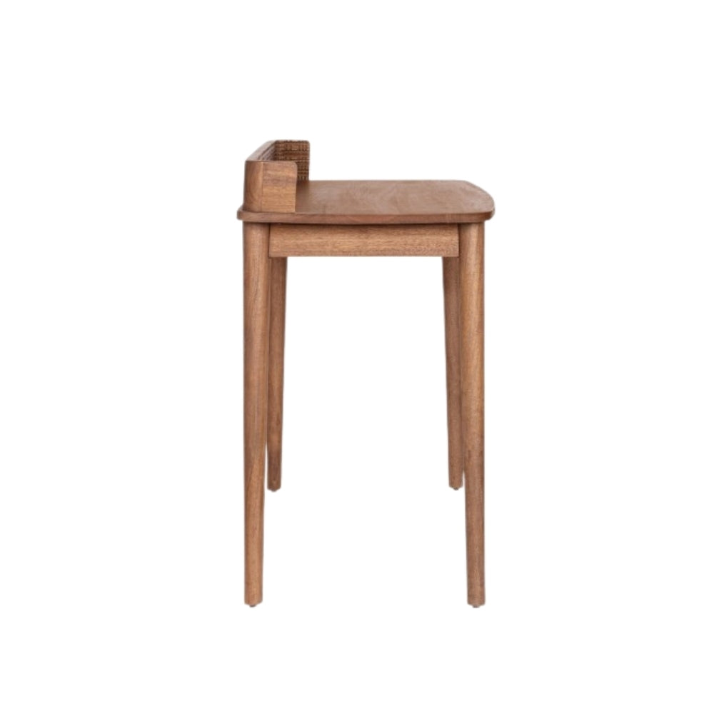 Una scrivania dallo stile contemporaneo e artigianale, perfetta per ambienti eleganti che valorizzano i dettagli fatti a mano e i materiali naturali. Realizzata con struttura in legno di mango e schienale in MDF, presenta un frontale intarsiato e lavorato a mano che dona unicità e raffinatezza al design. La finitura con vernice a base d’acqua protegge il legno esaltandone la venatura naturale. Le gambe da assemblare rendono il montaggio semplice e rapido. Ogni pezzo è unico, grazie alle variazioni tipiche della lavorazione artigianale. Ideale per studi, camere o angoli home office in stile moderno, boho o scandinavo, è un complemento funzionale e di grande impatto visivo.