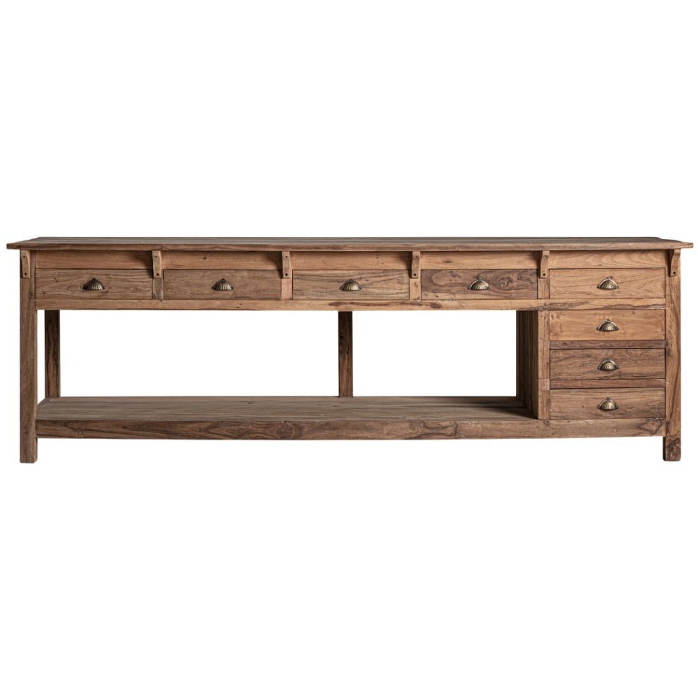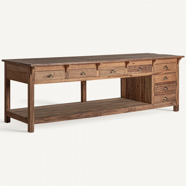 Lo stile country richiama il fascino autentico della campagna, perfetto per creare ambienti accoglienti e funzionali. È caratterizzato da linee semplici e materiali naturali, ideali per un arredamento che unisce estetica e praticità. Questa scrivania consolle realizzata in legno sostenibile si distingue per la sua solidità e versatilità. Dotata di 8 cassetti (43x38x9 cm ciascuno) e un ampio vano centrale (202x70x44 cm), offre spazio sufficiente per organizzare documenti e accessori. Il piano spesso 2,5 cm e la struttura robusta garantiscono una lunga durata, mentre il design marrone in stile coloniale si adatta perfettamente a chi cerca scrivanie studio vintage. Un elemento d’arredo funzionale e ricco di stile per ogni spazio domestico o professionale.