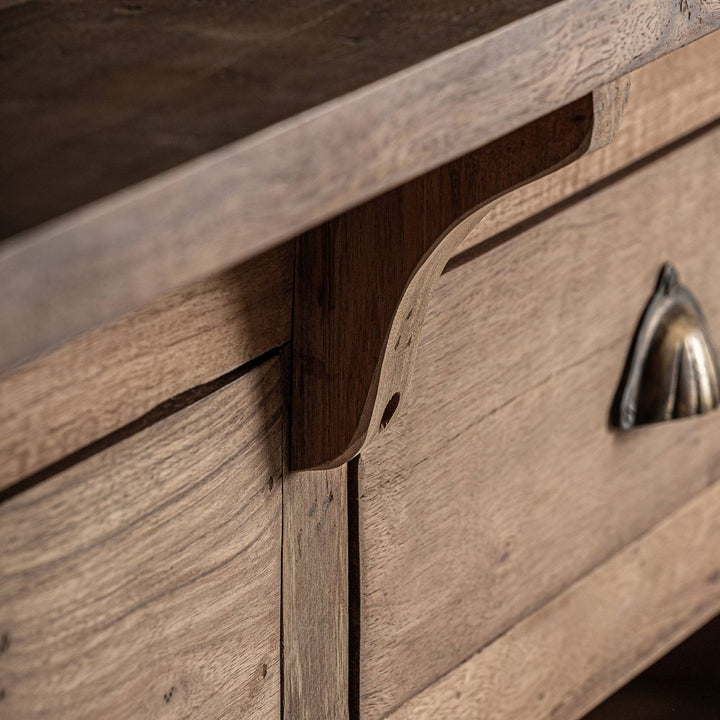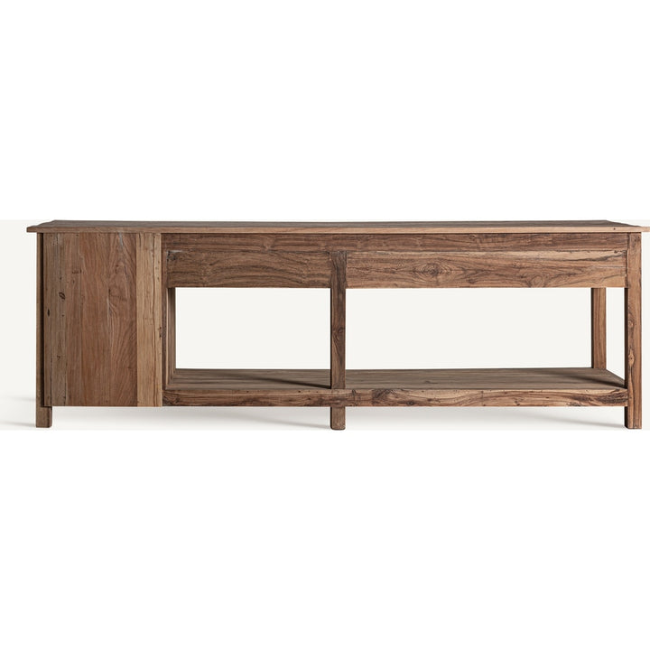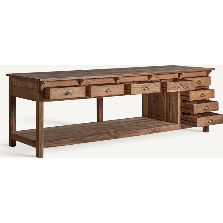 La Scrivania Consolle Country esprime il fascino autentico dello stile country, combinando materiali naturali e linee semplici per creare un arredo accogliente e funzionale. Realizzata artigianalmente in legno massello di recupero con finitura marrone, si distingue per solidità e versatilità. Dotata di otto cassetti (43x38x9 cm) e un ampio vano centrale da 202x70x44 cm, offre uno spazio organizzato e pratico per documenti, accessori o strumenti da lavoro. Il piano spesso 2,5 cm e la struttura robusta assicurano durata nel tempo, mentre le imperfezioni naturali del legno rendono ogni pezzo unico. Perfetta per ambienti country chic o spazi coloniali, è proposta con sconti fino al 70% su Ethnic Chic. Un arredo di pregio che unisce design rustico e funzionalità moderna.