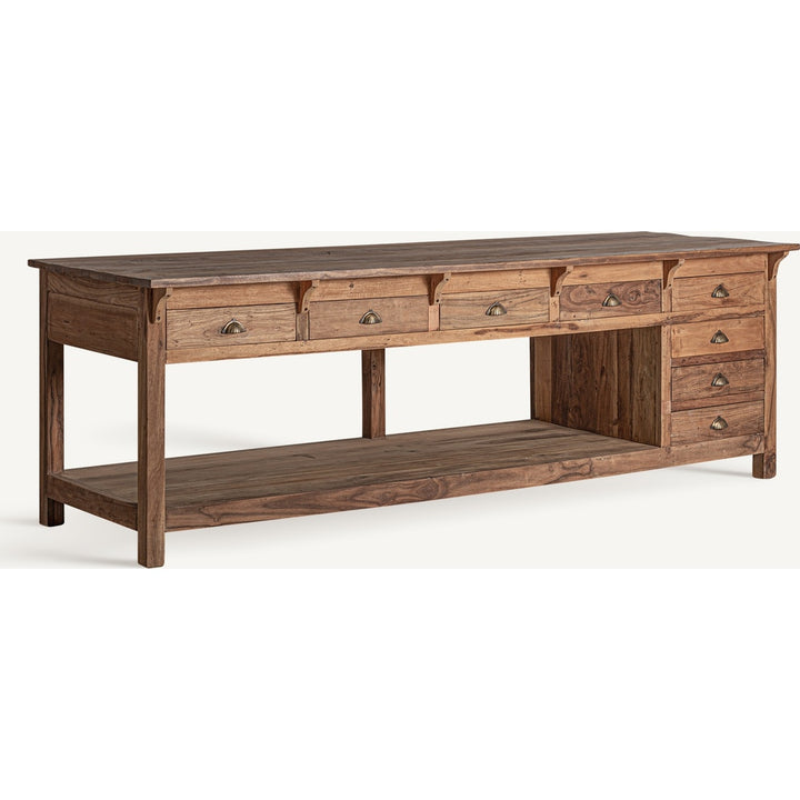 NOTE: Legno massello di recupero, 8 cassetti, vano centrale ampio, piano spesso 2,5 cm, peso 213 kg, lavorazione artigianale, portata 200 kg, gambe fisse 6x6 cm.