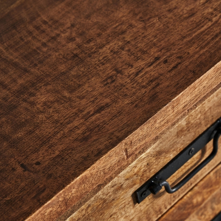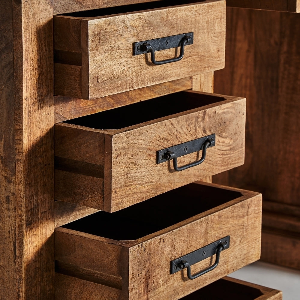 Questa elegante realizzazione in legno di mango si distingue per la sua robustezza e le sue linee raffinate. Con nove cassetti di diverse dimensioni, offre ampio spazio di archiviazione. La sua struttura solida permette di sostenere un peso fino a 70 kg, rendendola ideale per qualsiasi utilizzo, sia in un ufficio che in una stanza. Le sue gambe con uno zoccolo di 8 cm e la distanza tra di loro di 70 cm offrono stabilità e un aspetto distintivo. L'attenzione al dettaglio è evidente anche nello spessore del piano di 2,5 cm e nella spaziatura tra le cassettiere, che fornisce ulteriore spazio. La sua finitura naturale e la qualità del legno di mango lo rendono un pezzo di arredamento che può durare nel tempo.