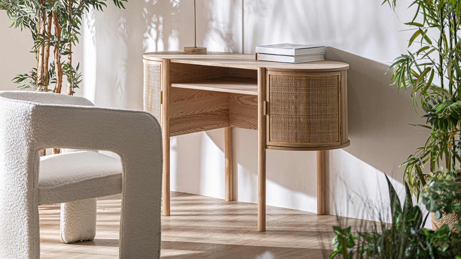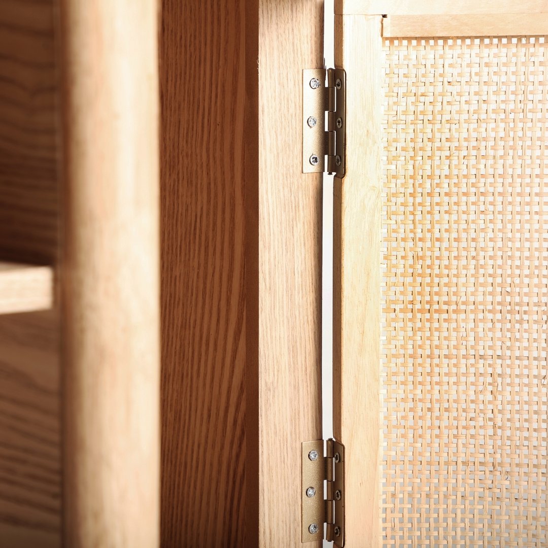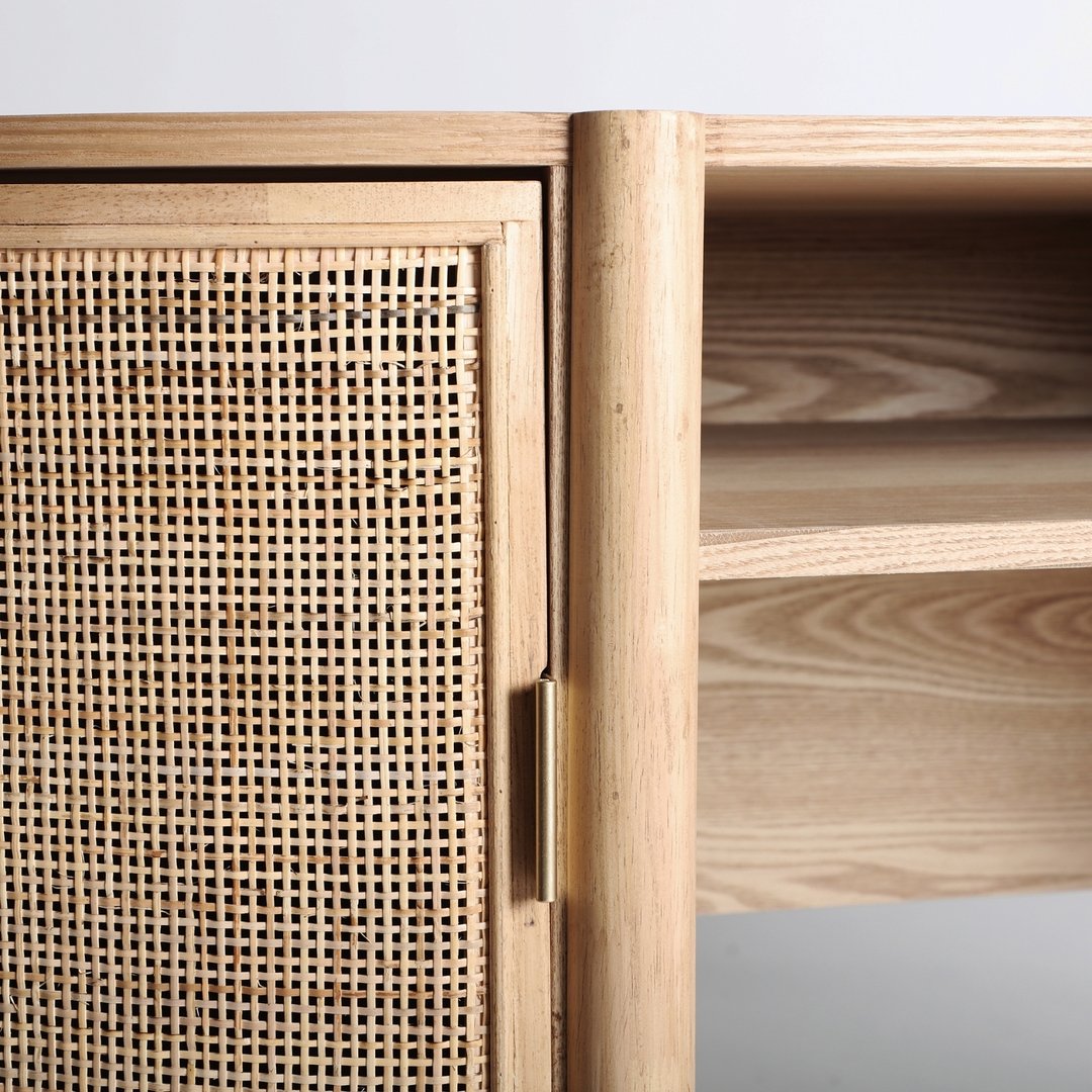 un design che sembra fondere caratteristiche dell'Art Déco con tendenze contemporanee. Il richiamo all'Art Déco è evidente nelle linee curve morbide, l'uso di materiali naturali come il legno, e nei dettagli decorativi come la rete di vimini sui pannelli frontali, che aggiungono un tocco di eleganza e un senso di artigianato raffinato. Contemporaneamente, la semplicità delle forme e l'assenza di ornamenti eccessivi lo rendono adeguato anche agli interni moderni, dimostrando una sottile equilibrio tra il vecchio e il nuovo.
