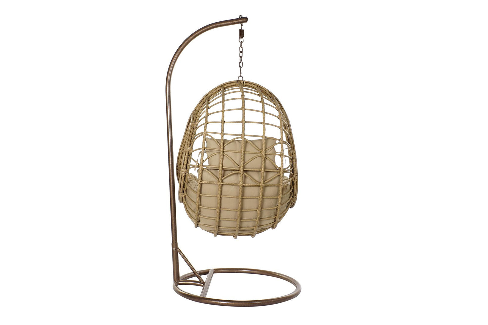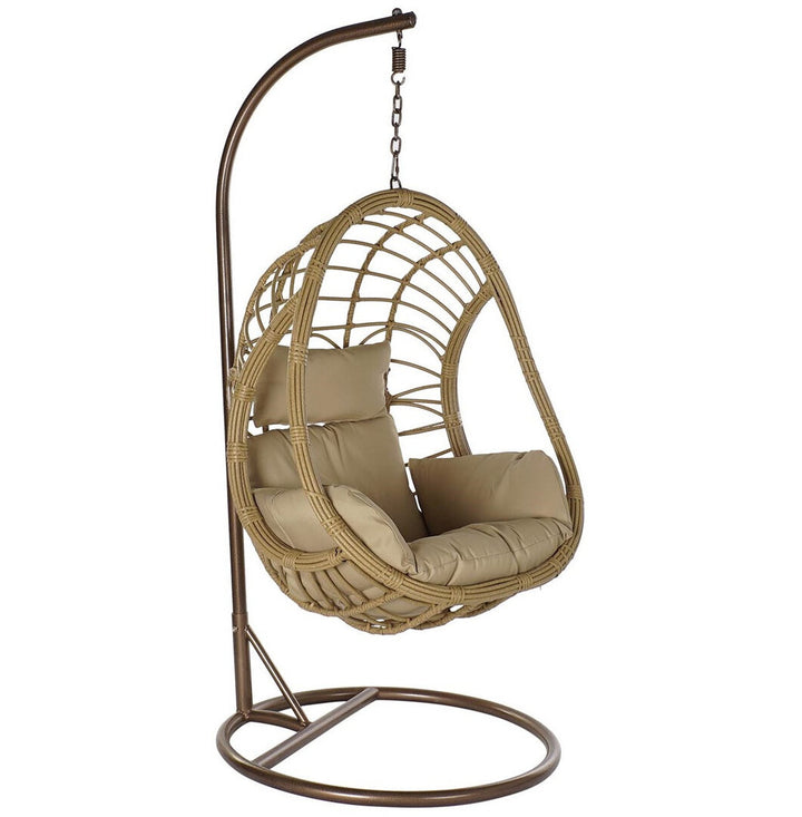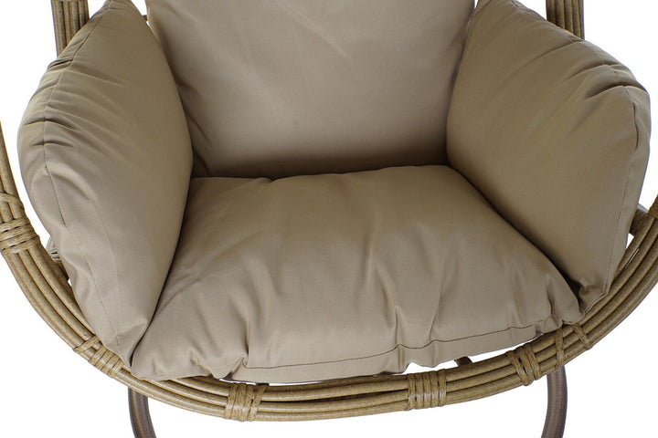 Una poltrona sospesa dallo stile moderno ed elegante, pensata per arredare il giardino o il terrazzo con comfort e leggerezza. La struttura in alluminio verniciato garantisce resistenza e facilità di spostamento, mentre il rivestimento in rattan sintetico color sabbia è ideale per l’uso esterno grazie alla sua durabilità e facilità di manutenzione. Completa di cuscini imbottiti beige, assicura una seduta avvolgente e rilassante. Con un peso di 25,3 kg e una portata massima di 120 kg, è adatta a ogni esigenza di relax all’aperto. Il supporto NON incluso è compatibile con basi circolari in metallo brunito. Perfetta per chi cerca sedie uovo da esterno, poltrone sospese in rattan o sedie da giardino con cuscini, aggiunge stile e funzionalità a qualsiasi spazio outdoor.