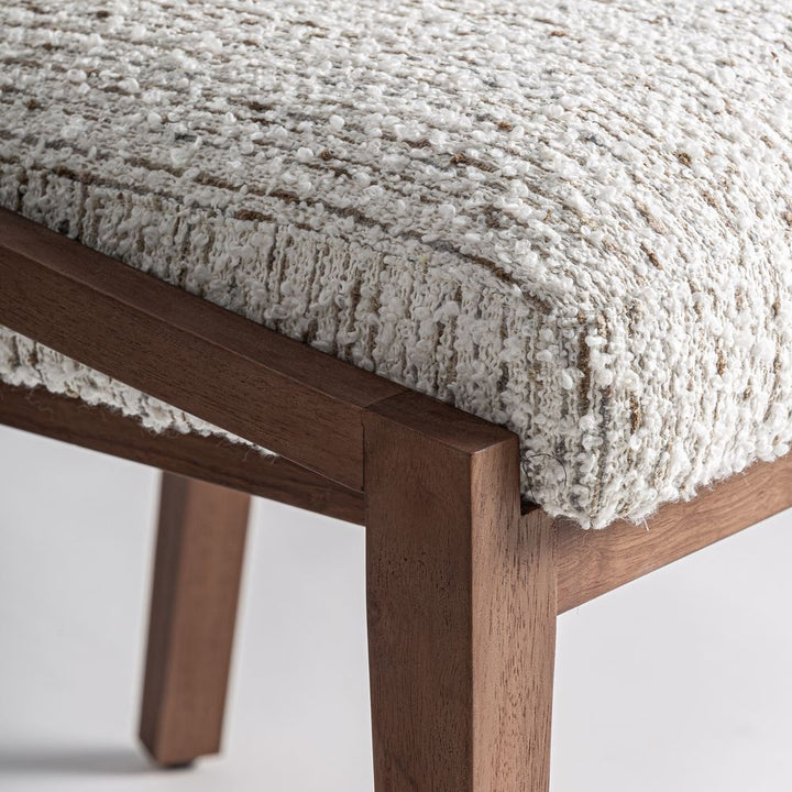 NOTE: Legno di gomma marrone, poliestere beige marmorizzato, schiuma, 11,6 kg, seduta 53 x 51 x 10 cm, altezza seduta 52 cm, portata 105 kg, lavorazione artigianale.