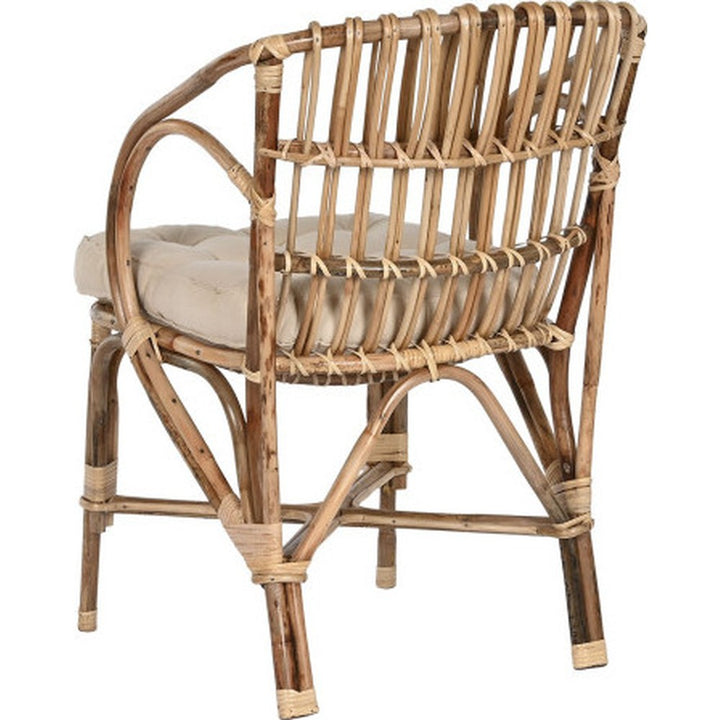 NOTE: Bamboo naturale, rattan intrecciato, cuscino imbottito, altezza seduta 58 cm, uso interno/esterno, design leggero e resistente.