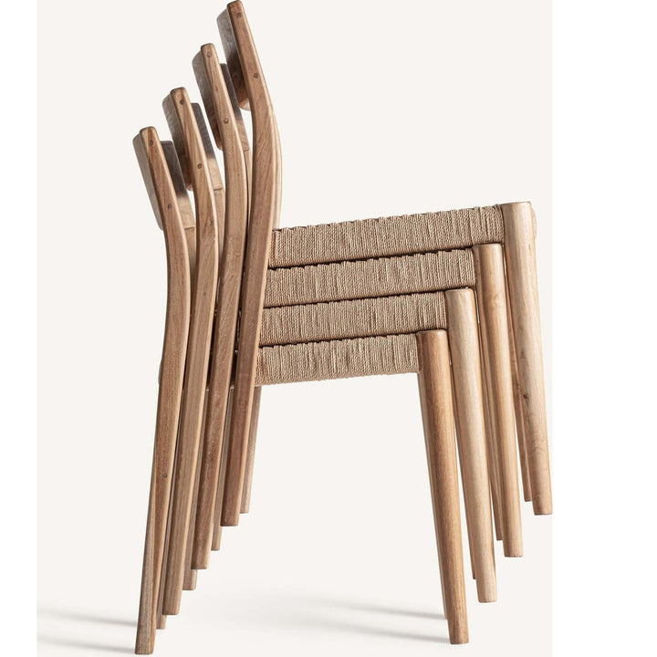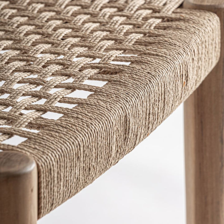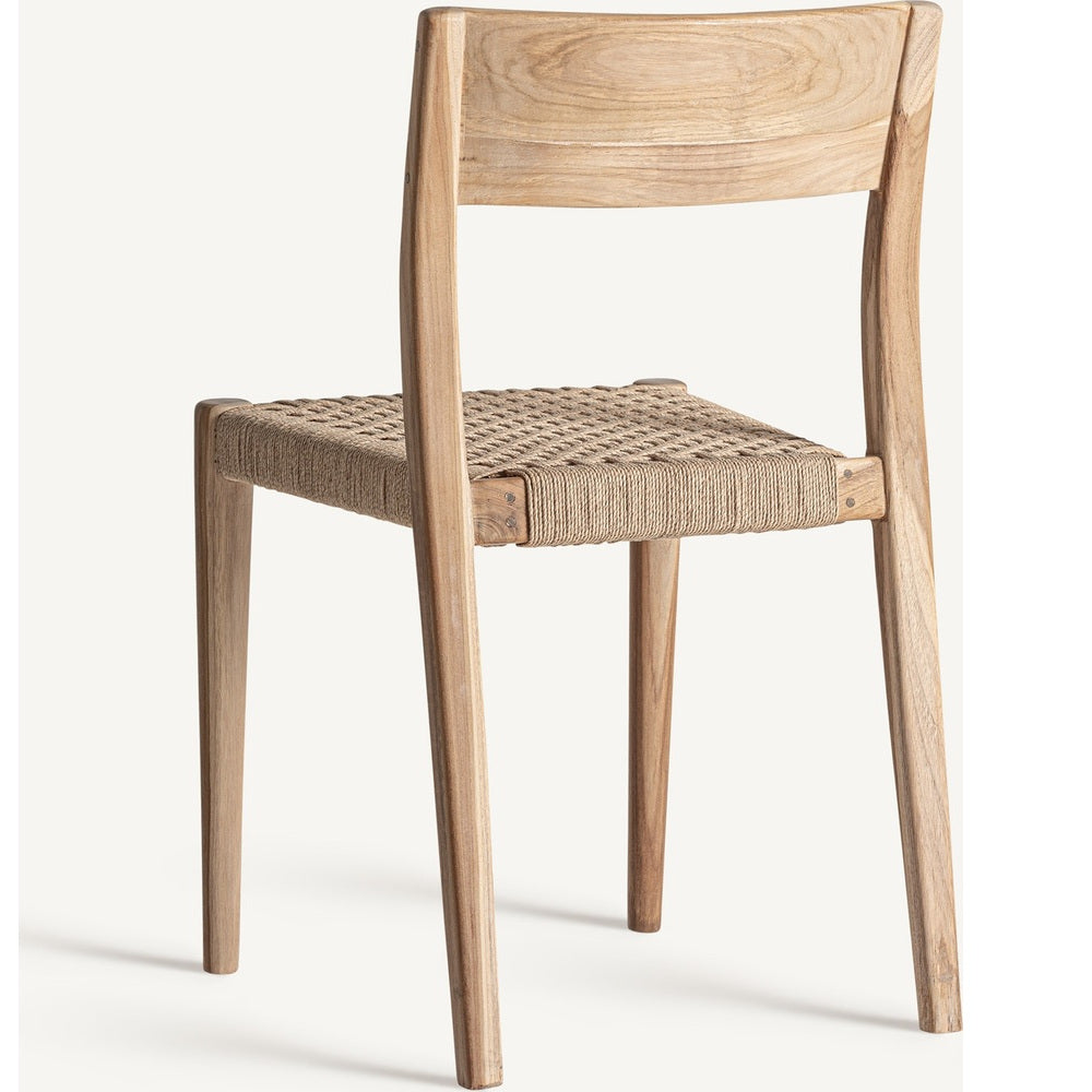 NOTE: Teak naturale e fibra intrecciata, peso 5,2 kg, seduta 35×45×5,5 cm, altezza seduta 48 cm, impilabile, lavorazione artigianale, variazioni naturali di tono e venatura.