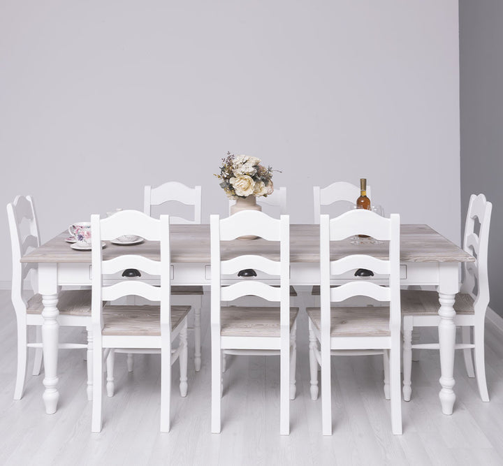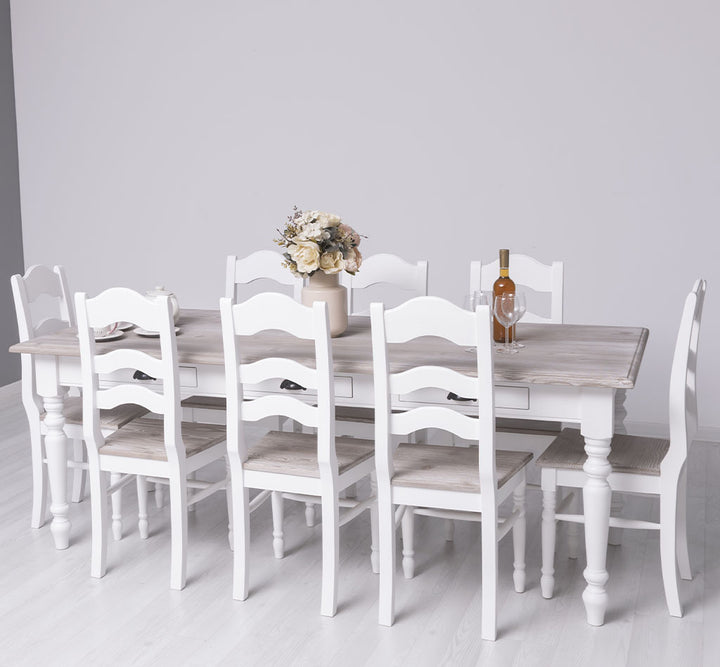Lo stile shabby chic è amato per il suo fascino rustico e senza tempo, che aggiunge calore e carattere a qualsiasi ambiente. Questa sedia è realizzata in legno massello di pino al 100% con una seduta in rovere massello, garantendo robustezza e longevità. Con dimensioni di 44 x 44 x H 102 cm, è ideale per chi cerca un design che unisca funzionalità ed estetica. La struttura e lo schienale solidi offrono un supporto confortevole, mentre le gambe tornite esaltano l’eleganza classica perfetta per soggiorno o cucina. Consegnata assemblata, questa sedia è pronta per l'uso immediato, e la sua costruzione di qualità
