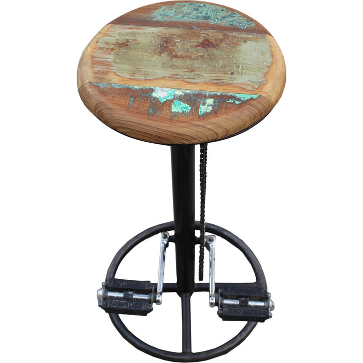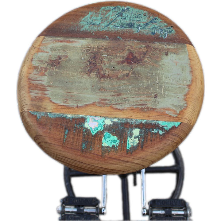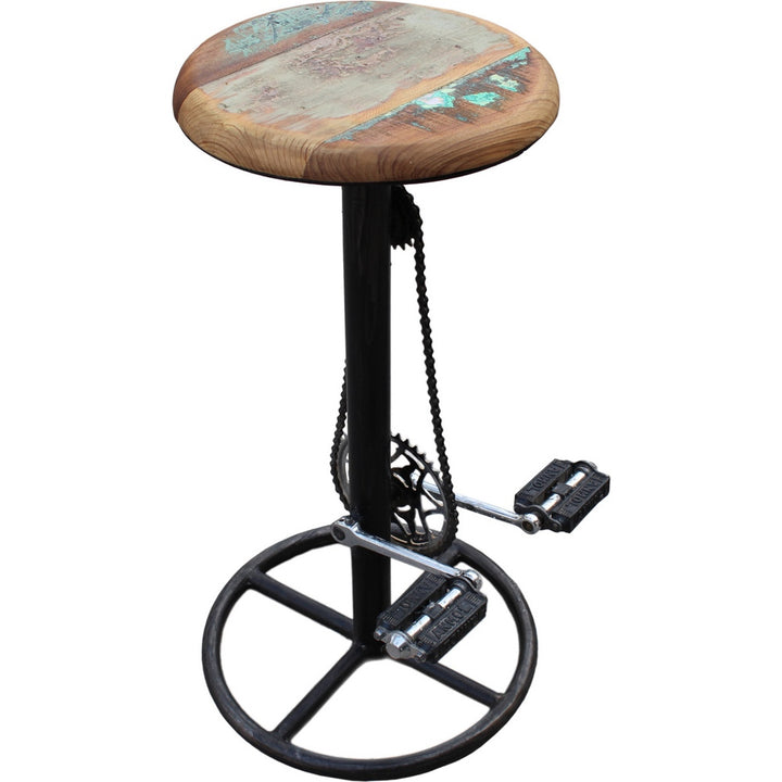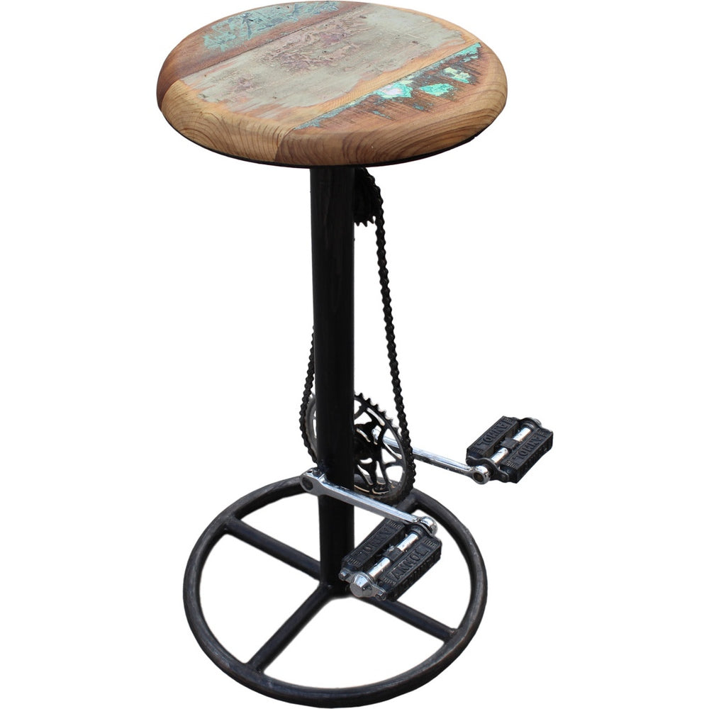 NOTE: Legno di mango riciclato, acciaio anticato, catena e pedali di bicicletta riciclati, 10,3 kg, altezza seduta 83 cm, finitura vintage artigianale.