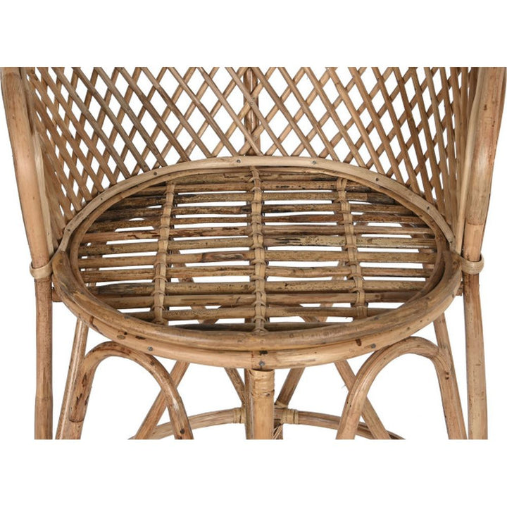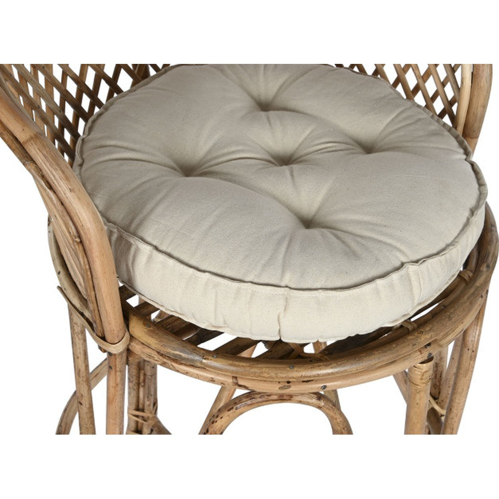NOTE: Bamboo naturale, rattan intrecciato, cuscino imbottito, altezza seduta 79 cm, peso 4 kg, uso interno/esterno riparato.