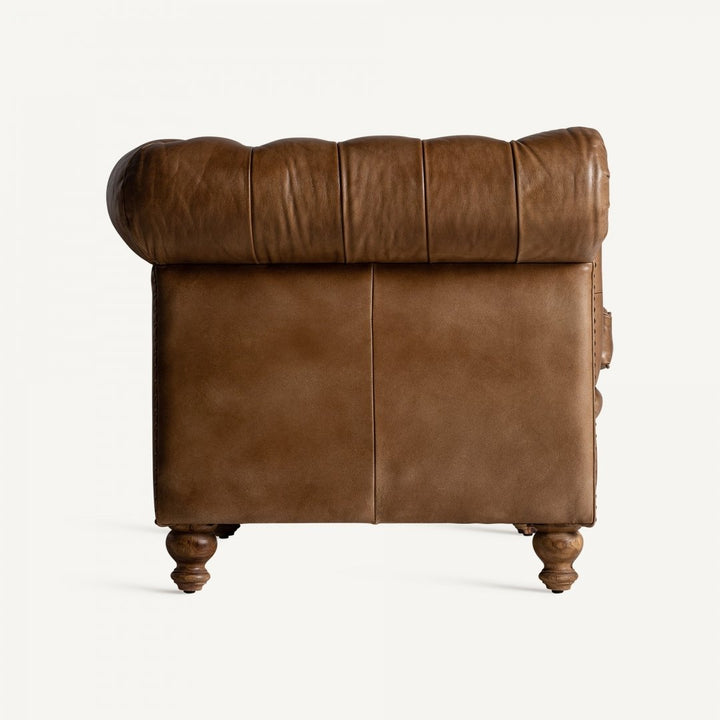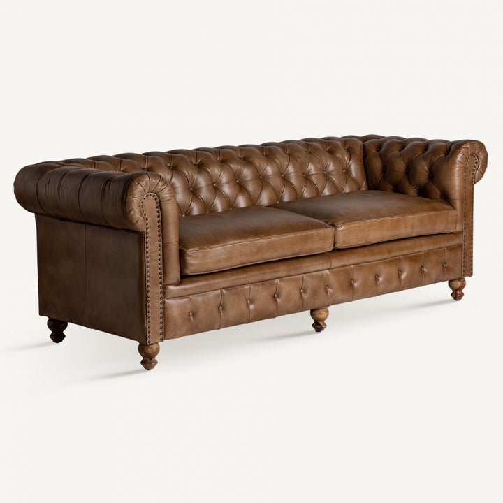 Aggiungi un tocco di classe e comfort senza tempo al tuo spazio con il nostro Sofà Capitonné Marrone di stile vintage. Questo sofisticato pezzo d'arredamento unisce la bellezza senza tempo dello stile vintage con materiali di alta qualità per offrire una seduta lussuosa.