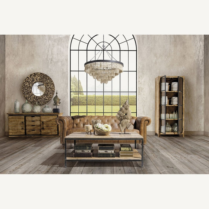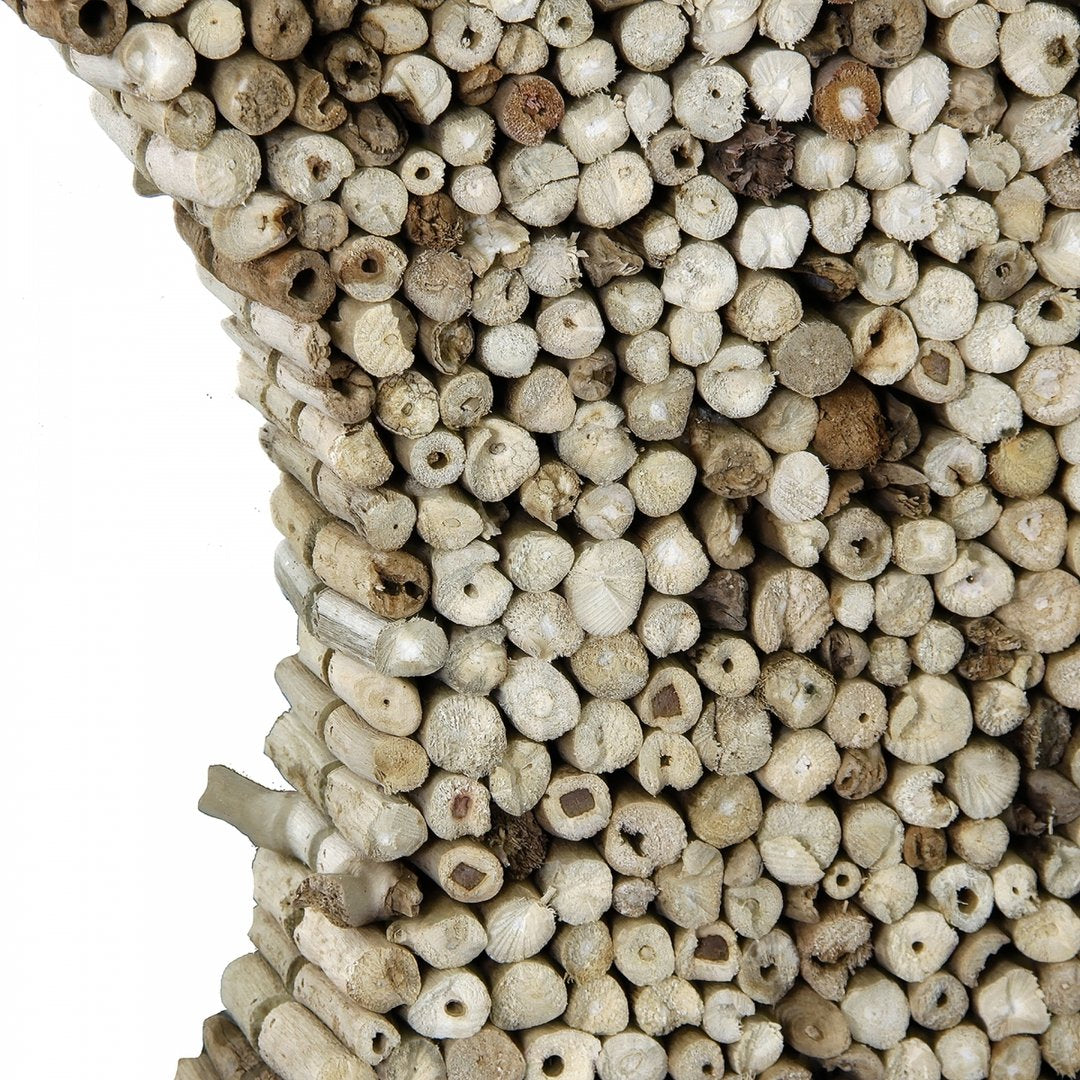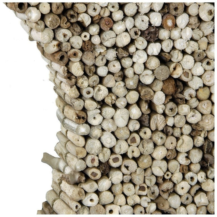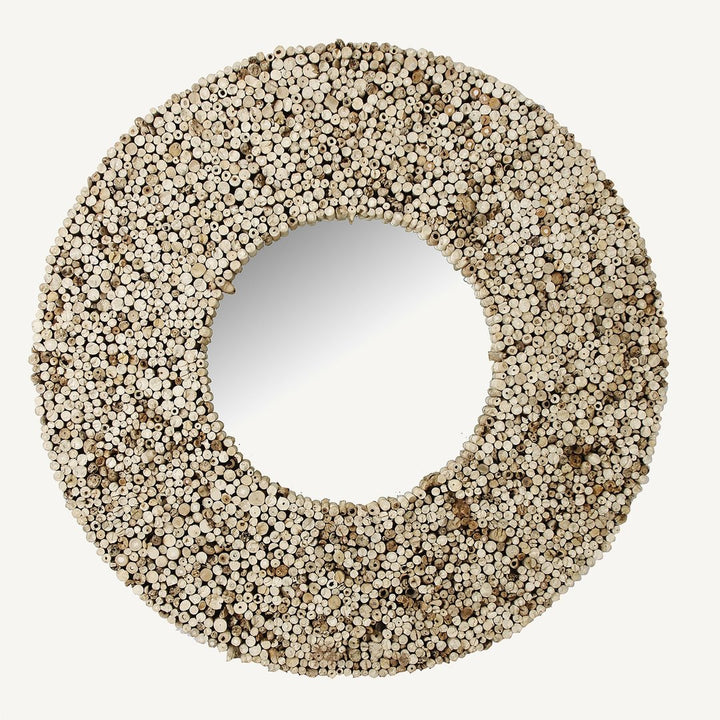 Questa cornice è realizzata in uno stile rustico e naturale, utilizzando sezioni di rami di teak per creare un motivo texture che incornicia lo specchio. Il teak è noto per la sua durabilità e per la sua resistenza agli elementi, il che rende questo tipo di cornice adatta sia per interni che per esterni. Il design può essere associato al movimento di design organico, che valorizza materiali naturali e forme trovate in natura. Questo stile è spesso scelto per ambienti che desiderano un senso di calma e connessione con l'ambiente naturale.