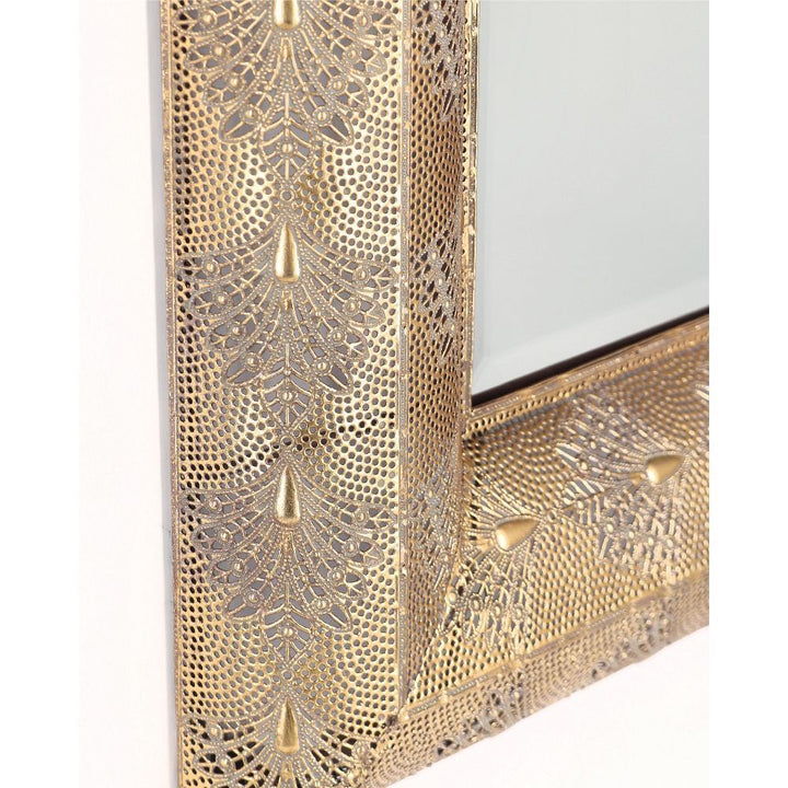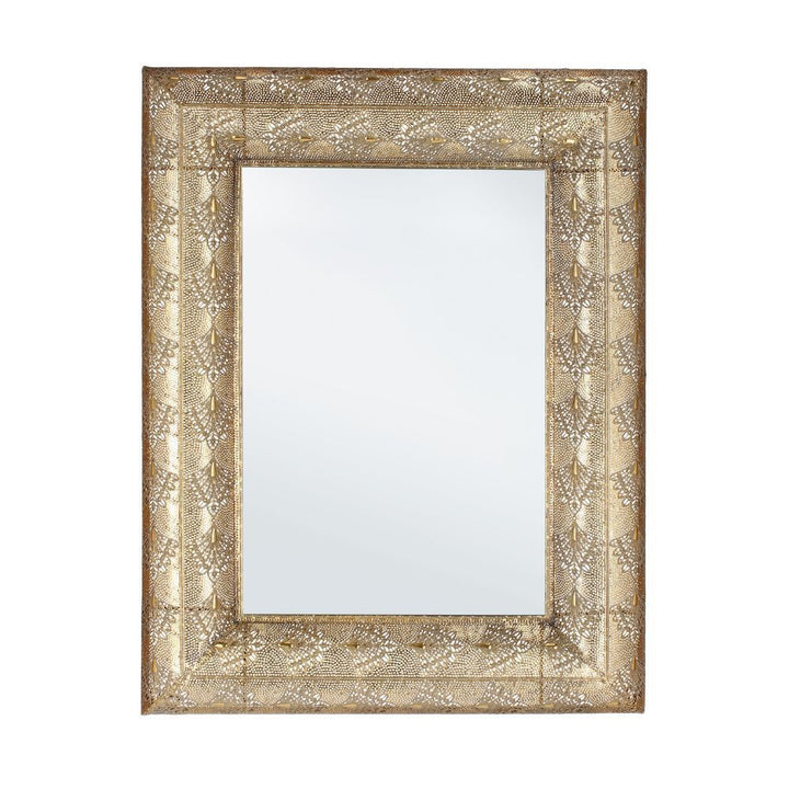Uno specchio dallo stile glamour e sofisticato, perfetto per ambienti che desiderano un tocco di eleganza artigianale e riflessi preziosi. Realizzato artigianalmente in metallo dorato con lavorazione traforata e dettagli ornamentali, è abbinato a uno specchio che amplifica la luce e valorizza lo spazio. Ogni pezzo è unico, con leggere variazioni di colore, tonalità o imperfezioni che esaltano il carattere fatto a mano del prodotto. Ideale per arredare ingressi, camere o soggiorni in stile glam, classico o boho chic. La struttura solida e decorativa rende questo specchio un complemento di grande impatto estetico e raffinatezza.