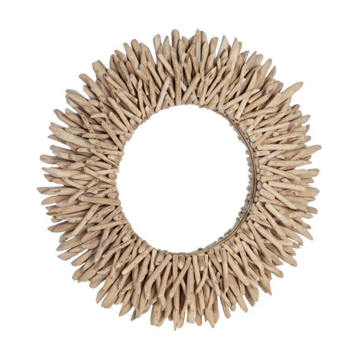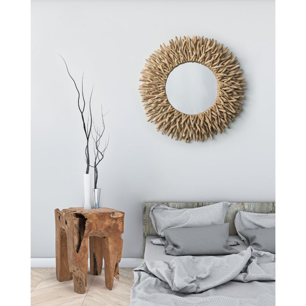 Uno specchio dallo stile naturale e materico, perfetto per arricchire l’ambiente con un elemento decorativo ispirato alla natura e dal forte impatto visivo. Realizzato artigianalmente con rami di teak disposti a raggiera e finitura naturale, presenta una cornice tridimensionale che circonda uno specchio centrale da Ø60 cm. Ogni pezzo è unico, con variazioni nelle forme e nelle venature che raccontano la bellezza autentica del legno. Ideale per ambienti in stile boho, coastal, etnico o rustico, questo specchio dona calore e personalità a pareti di ingressi, living o camere da letto. Un complemento scenografico e sostenibile, pensato per chi ama arredare con materiali naturali e design artigianale.