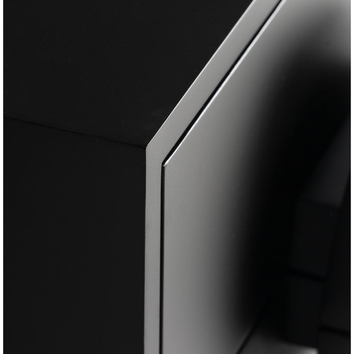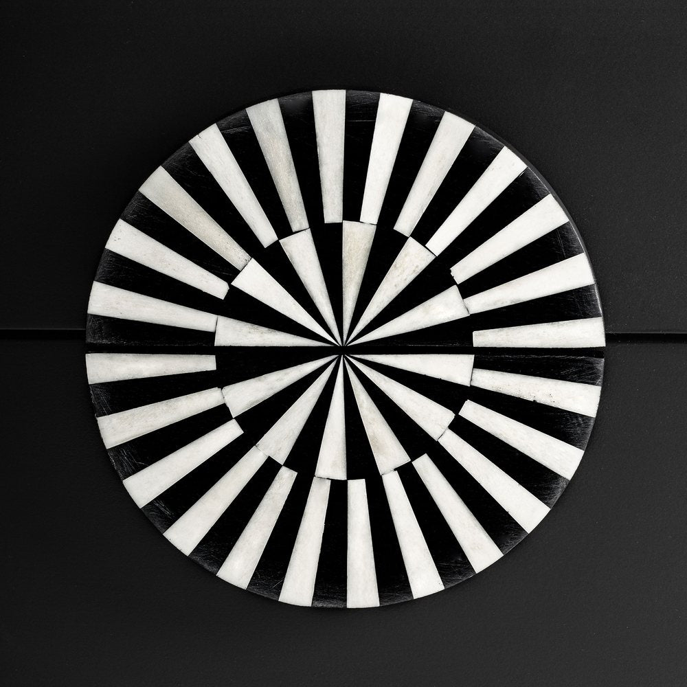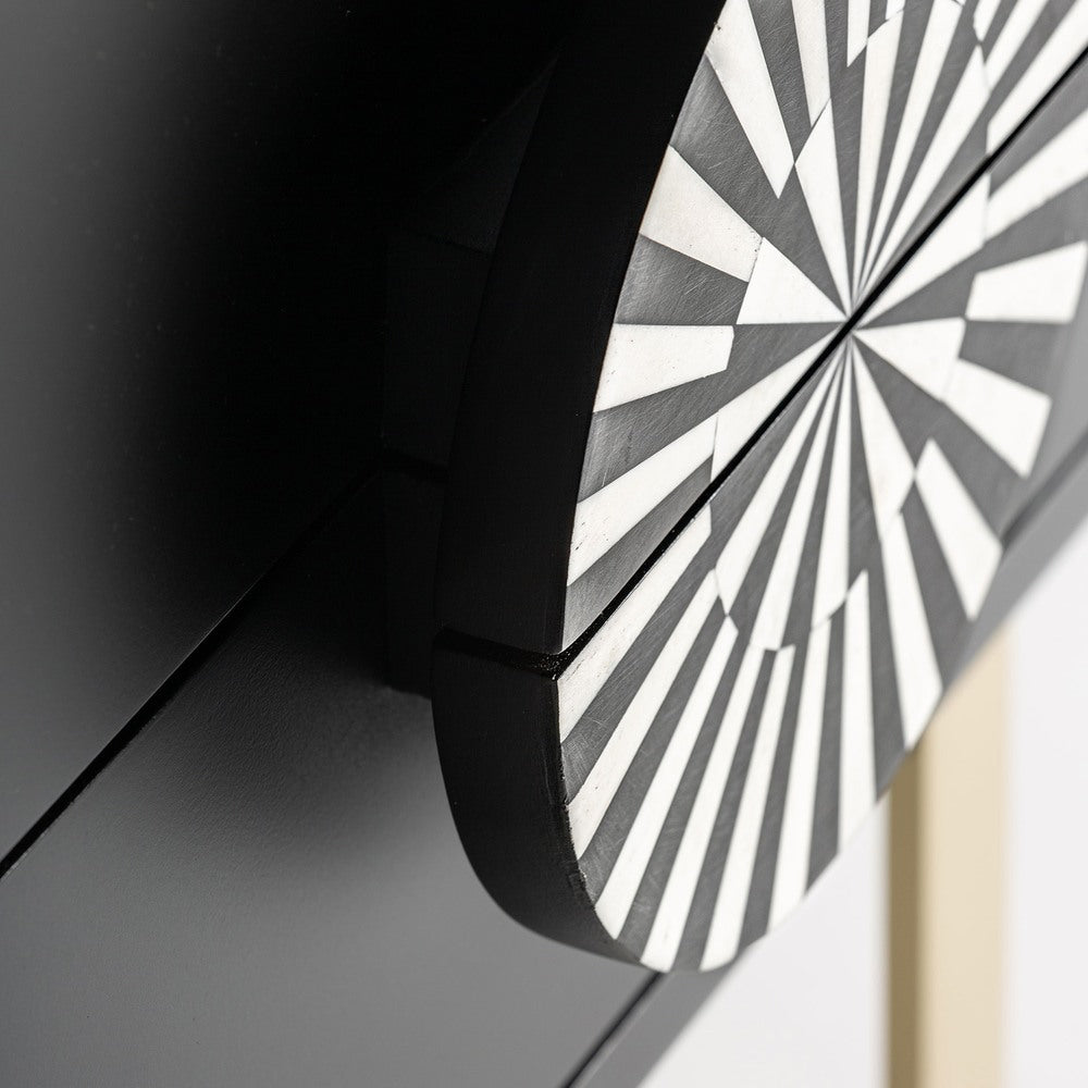 NOTE: Struttura in MDF nero con inserti in osso bianco, base in ferro dorato, 2 cassetti, peso 25 kg, gambe regolabili, finitura artigianale di pregio.