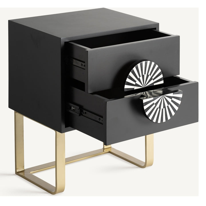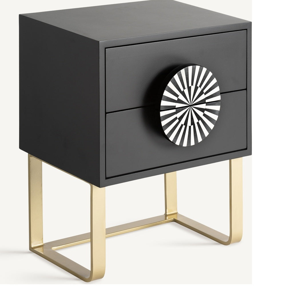 Lo stile Art Déco rivive in questo raffinato tavolino comodino in ferro dorato con inserti in osso bianco e struttura in legno MDF nero. Un omaggio al lusso d’altri tempi, reinterpretato in chiave moderna per ambienti eleganti e ricercati. Le linee geometriche e i contrasti cromatici tra nero, bianco e oro conferiscono al mobile un fascino scenografico, ideale per camere da letto o salotti di design. Dotato di 2 cassetti spaziosi (40×24×13 cm), offre spazio pratico per accessori o piccoli oggetti, mantenendo un’estetica impeccabile. Solido e armonioso, con gambe in ferro (4×1×26 cm) e piano spesso 2 cm, sostiene fino a 60 kg. Perfetto per ambienti Art Déco e moderni di lusso o per camere eleganti e contemporanee, è proposto con sconti fino al 70% su Ethnic Chic.