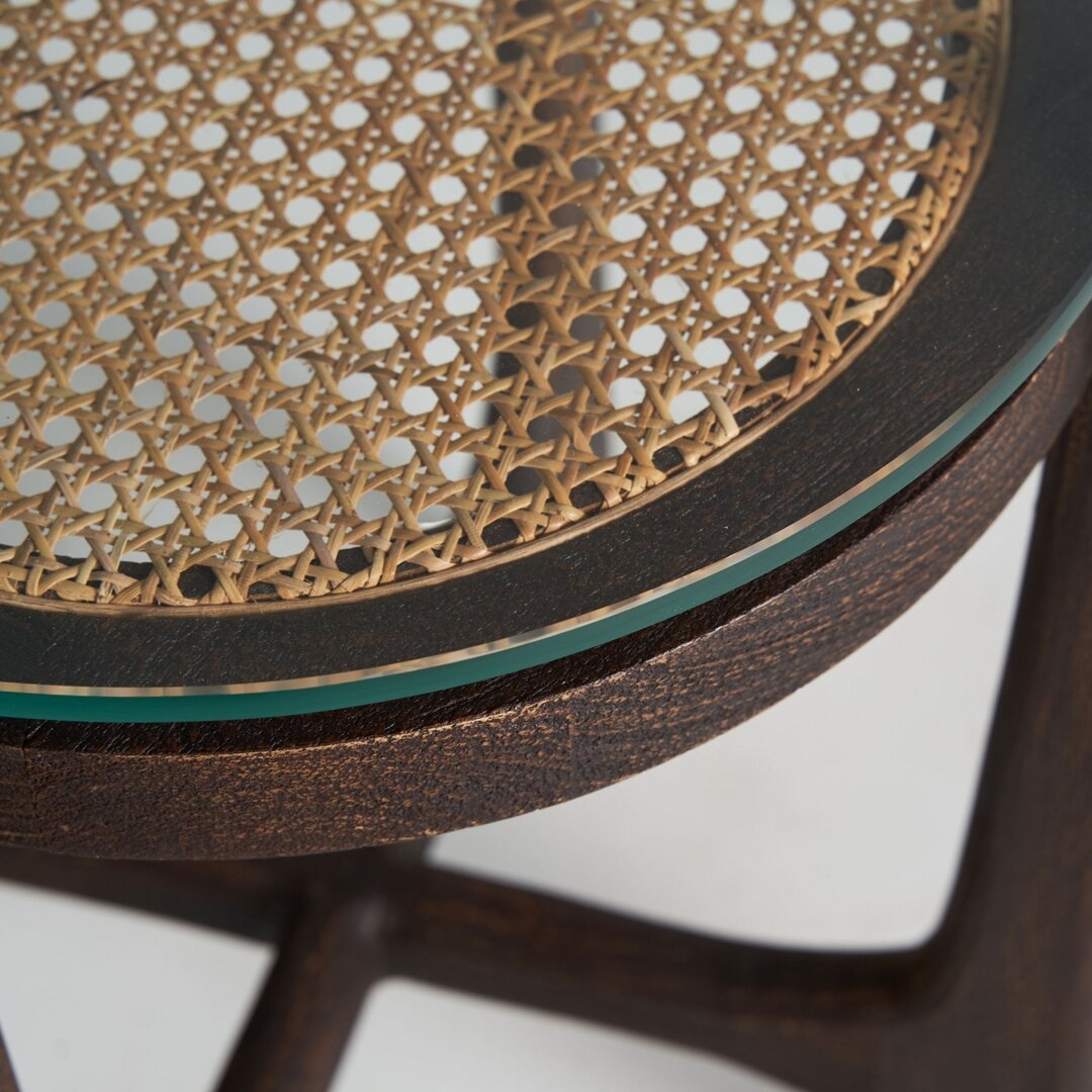 Un perfetto equilibrio tra natura ed eleganza, questo tavolino rotondo è il complemento ideale per ambienti dal gusto vintage e raffinato. La combinazione di materiali naturali e trasparenze lo rende un elemento di design unico e versatile.