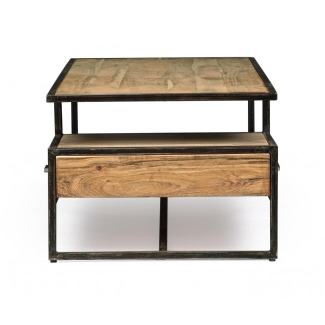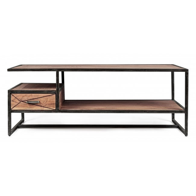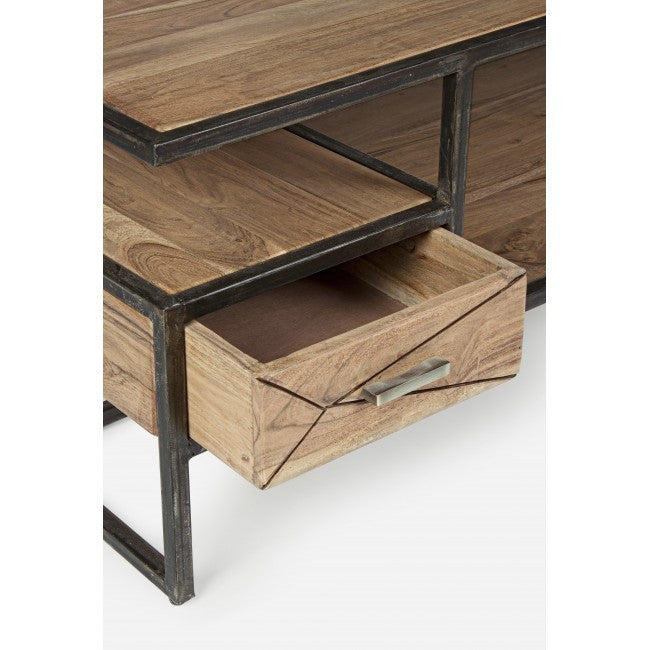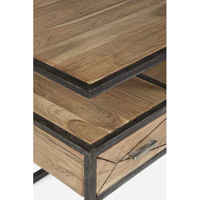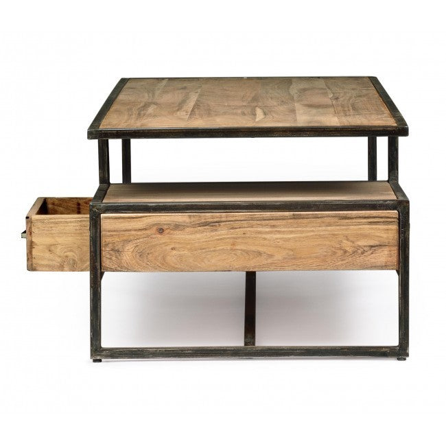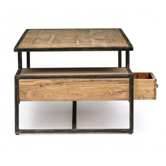 Tavolino New Industrial in legno massello di acacia e acciaio, con cassetto estraibile su entrambi i lati. Realizzato artigianalmente, misura 120 x 60 x H 45 cm. Un tavolino etnico unico, ora disponibile a un prezzo speciale.