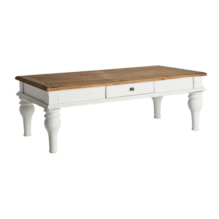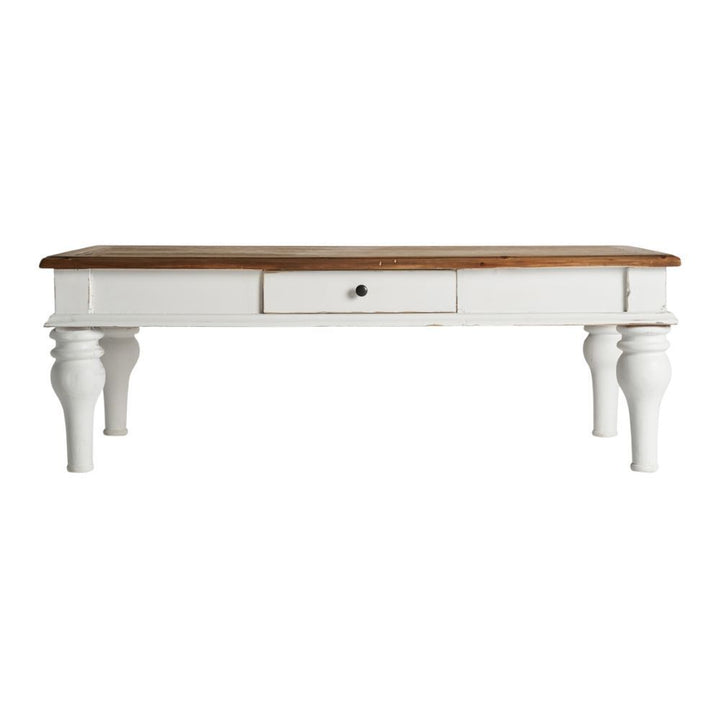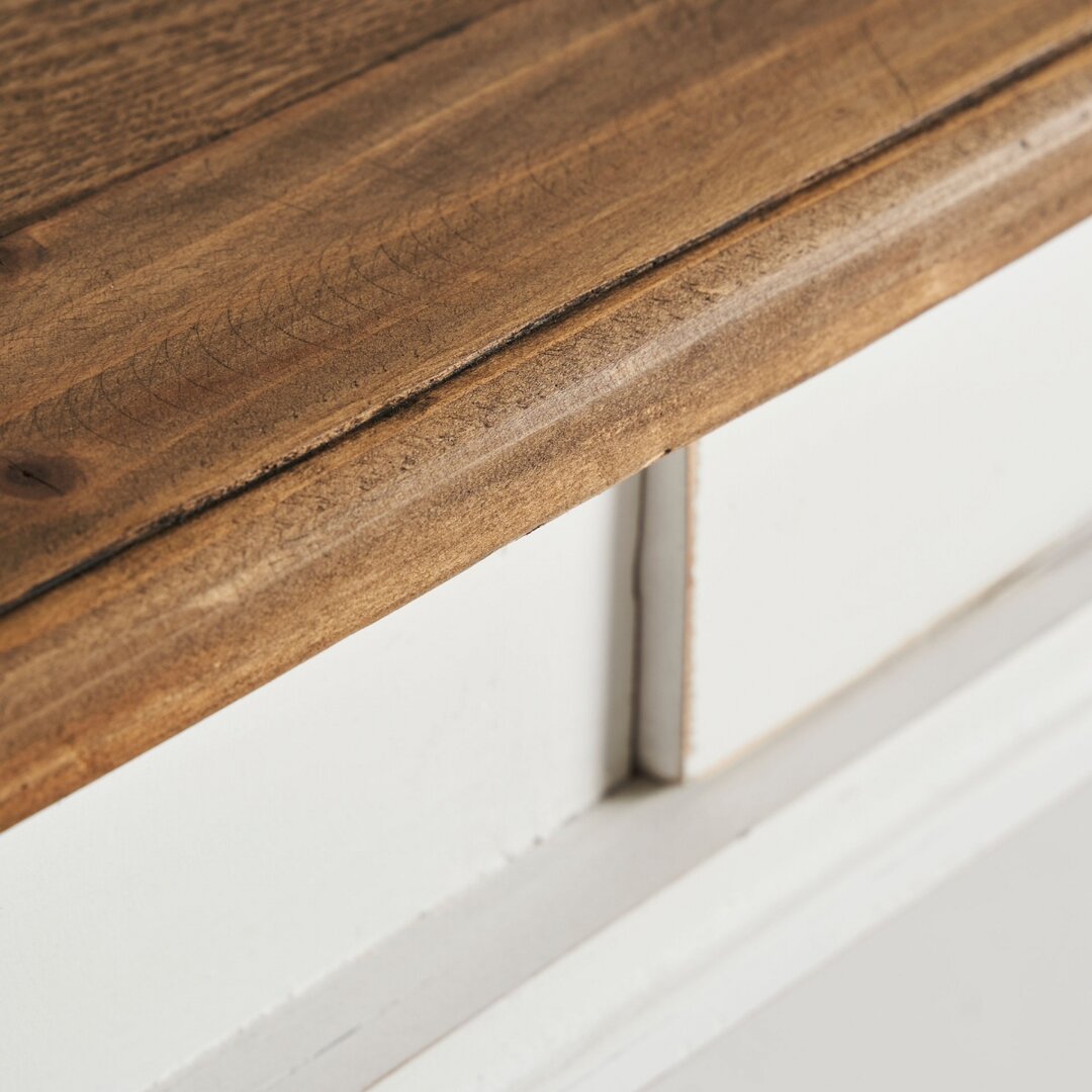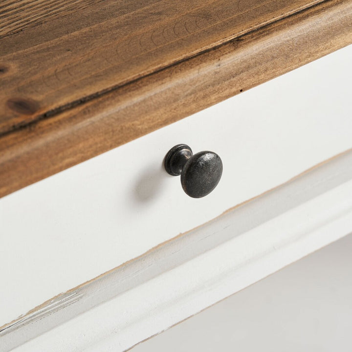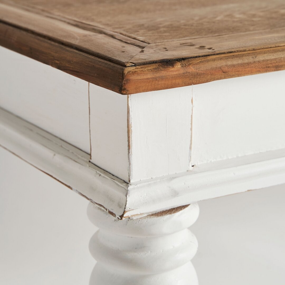 Realizzato in legno di pino riciclato, presenta una finitura in bianco decapato che esalta il calore del legno naturale. Il piano superiore, dal colore naturale, offre un contrasto armonioso con la struttura bianca. Le gambe tornite conferiscono un’eleganza classica, mentre il cassetto centrale aggiunge un pratico spazio contenitivo. Con un peso di 18,3 kg, è un complemento d’arredo resistente e sofisticato, perfetto per ambienti dallo stile shabby chic e provenzale.