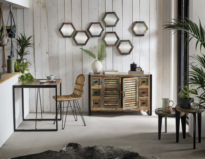 Mobili realizzati con legno riciclato trattato e recuperato per creare ambienti con uno stile industrial allegro e colorato.