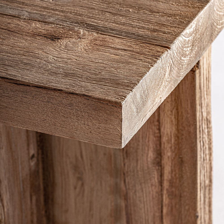 NOTE: Teak riciclato naturale, piano spesso 5 cm, piedini regolabili, portata 50 kg, peso 15 kg, realizzato a mano con finitura resistente all’esterno.