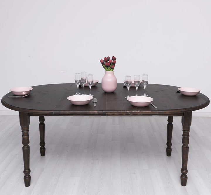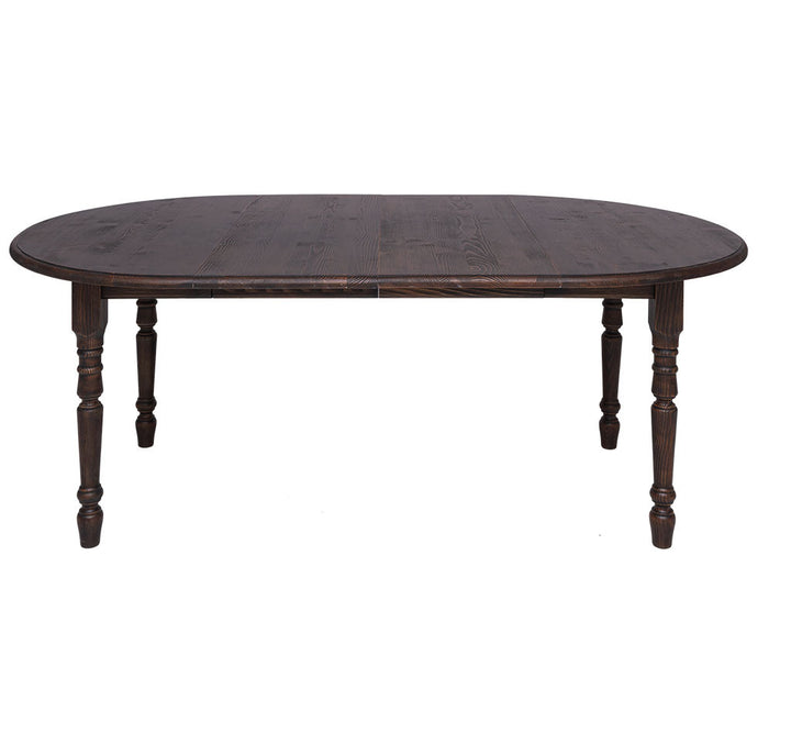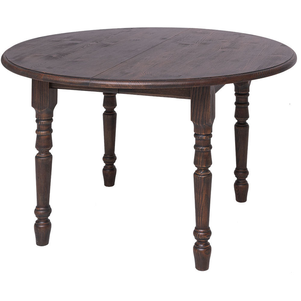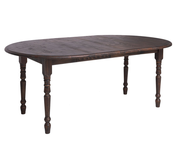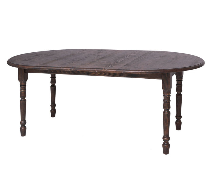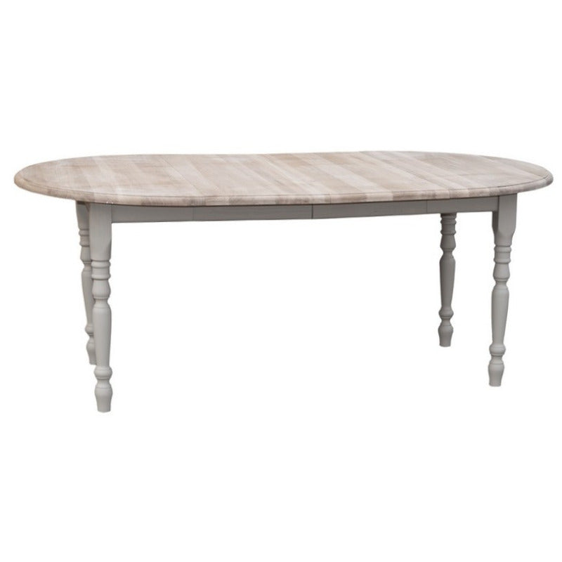 Tavolo da pranzo in stile provenzale, realizzato in legno massello di pino 100% di alta qualità, con piano in legno massello di rovere. Questo tavolo rotondo può essere allungato fino a 198 cm grazie a due prolunghe da 41 cm ciascuna, permettendo di ospitare più persone in modo comodo e funzionale.