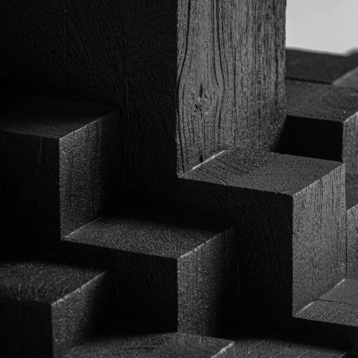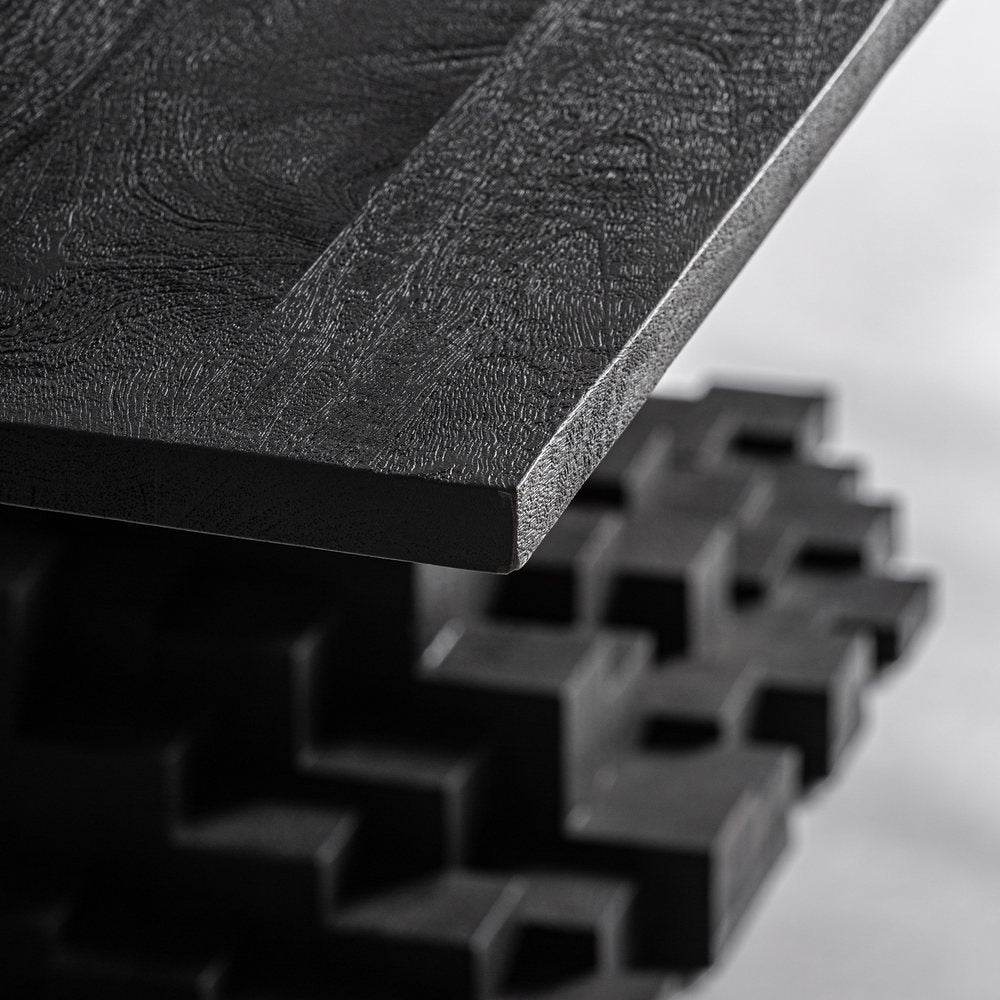 Lo stile brutalist di lusso si esprime attraverso forme architettoniche e volumi monumentali, creando ambienti di forte impatto visivo. Il tavolo Eclipse in legno di mango nero interpreta questo linguaggio con una base centrale scultorea ispirata a strutture voxel e geometrie digital-organic, evocando la forza materica della pietra vulcanica. La finitura sabbiata e scura richiama l’estetica del legno bruciato, rendendolo perfetto per sale da pranzo contemporanee, loft, ville e ambienti hospitality di alto livello.