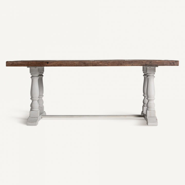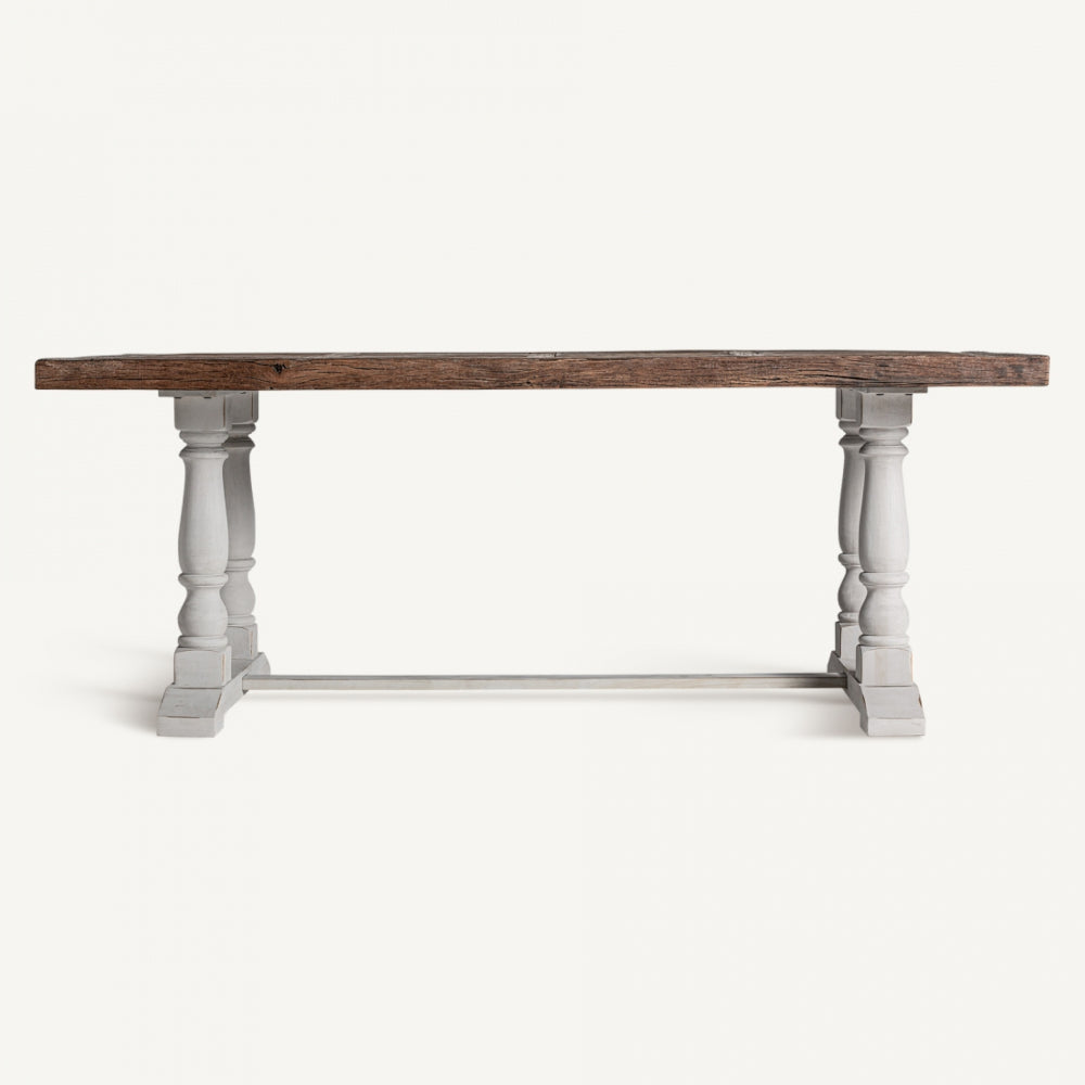 Realizzato con legno di olmo riciclato e legno di mango, questo tavolo combina tradizione e sostenibilità per creare un pezzo d'arredamento unico.
