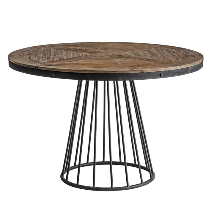 Lo stile industriale di questo tavolo è evidente nella combinazione di materiali e nella forma rotonda. Questo design versatile si adatta perfettamente a una varietà di ambienti, dalla cucina al soggiorno, creando un punto focale accattivante.