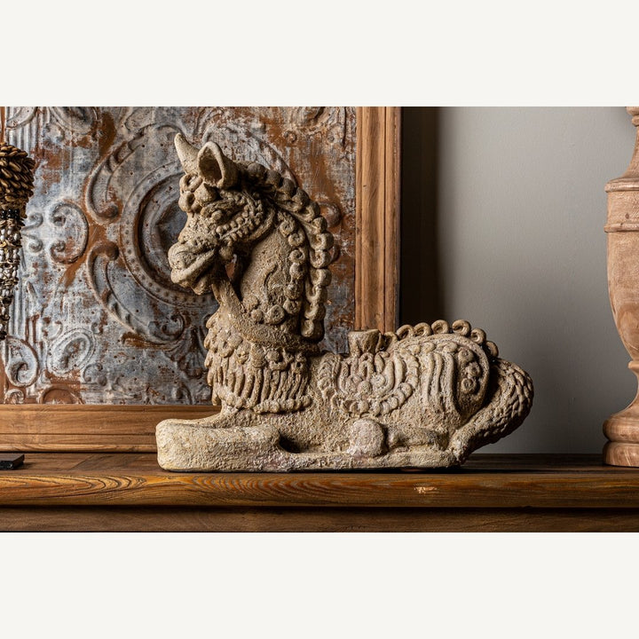 Questa figura decorativa di cavallo nei toni del verde invecchiato è un omaggio allo stile orientale classico, ideale per aggiungere un tocco di raffinatezza e autenticità ai tuoi ambienti. Realizzata in terracotta, questa scultura è caratterizzata da una lavorazione artigianale che ne esalta ogni dettaglio, con leggere variazioni di tono e piccole imperfezioni che aggiungono valore e unicità. Perfetta per essere collocata su un tavolo, una mensola o una console, questa figura è un complemento d’arredo ideale per soggiorni, studi o ingressi dallo stile classico o etnico. La finitura in verde invecchiato dona un aspetto vintage, rendendo questa scultura un punto focale di grande impatto visivo. Un pezzo unico per chi ama l'arte decorativa e l’artigianato orientale.