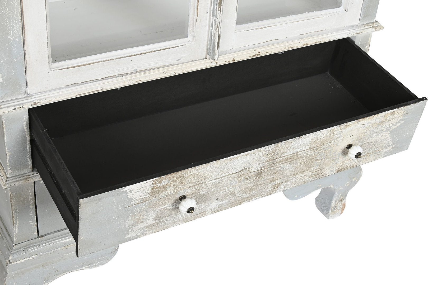 Finitura, completamente realizzata artigianalmente, esterno decapato in grigio e bianco vintage, maniglie in bronzo e porcellana bianca.