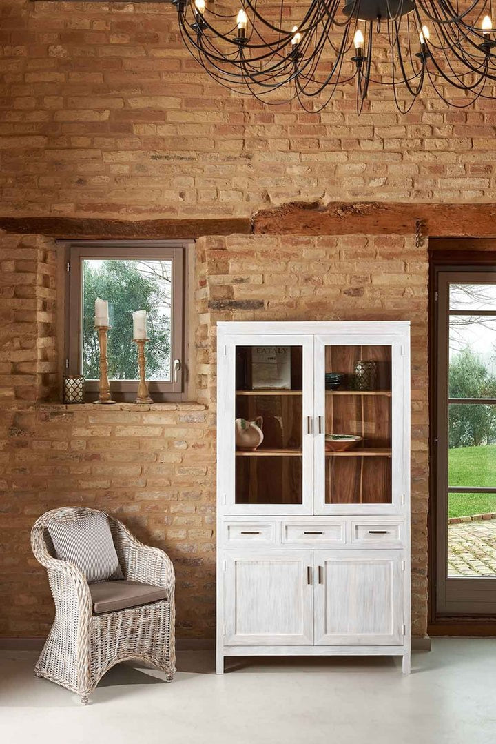 La versione sbiancata della Vetrina Credenza Alta aggiunge una luminosità unica agli interni in stile shabby chic, rustico o etnico, unendo estetica raffinata e funzionalità. Realizzata artigianalmente in legno massello di Teak sbiancato, questa credenza misura 105 x 38 x 195 cm e offre spazio ottimale con 2 ante a vetro, 3 cassetti centrali e 2 ante in legno, perfetta per organizzare e esporre con eleganza. La finitura a cera sbiancata preserva le caratteristiche naturali del legno, esaltandone le venature sotto una nuova luce fresca e accogliente. Disponibile con un supplemento del 20%, il mobile vetrina in bianco decapé è ideale per chi cerca di aggiungere un tocco di stile luminoso e arioso all'arredamento della propria casa.
