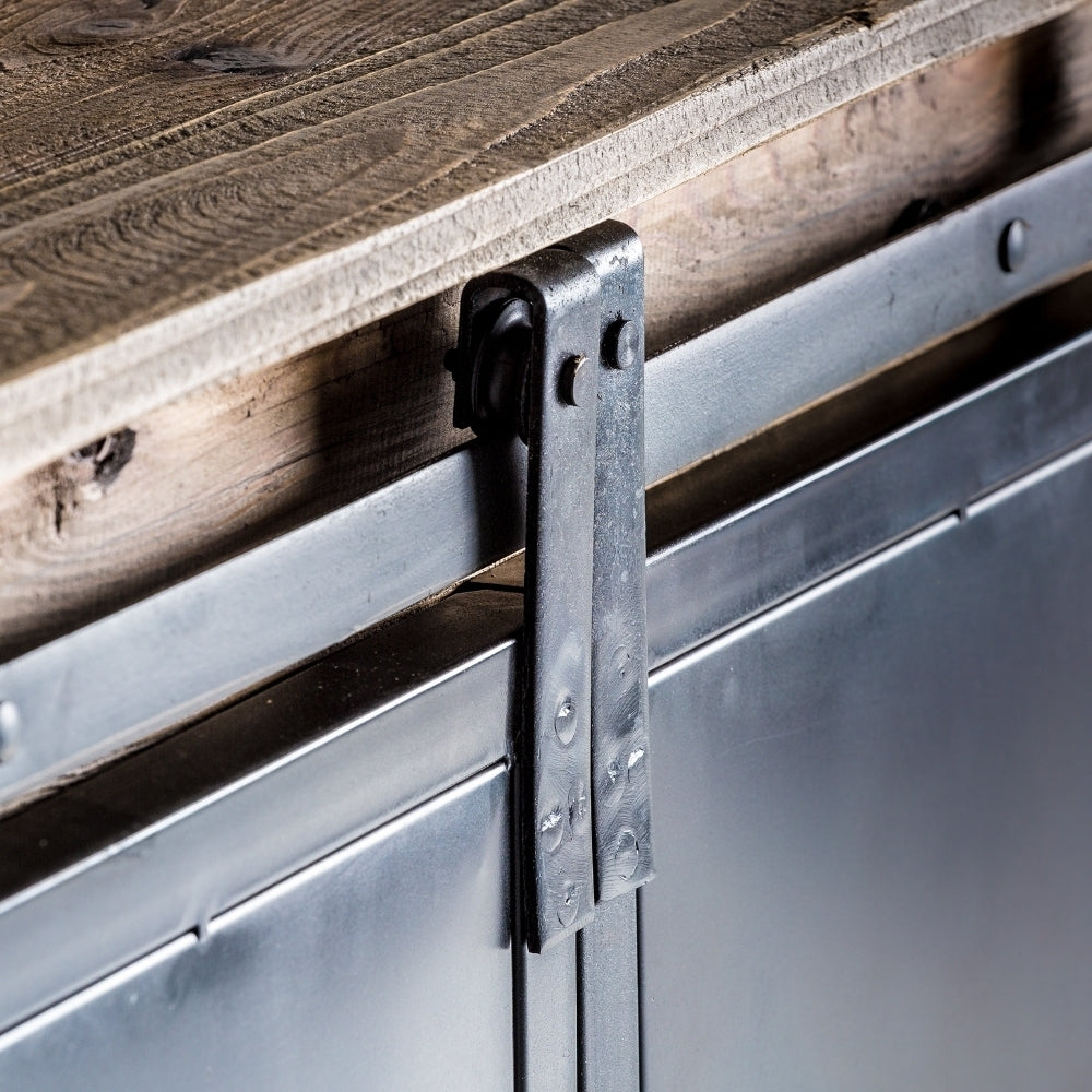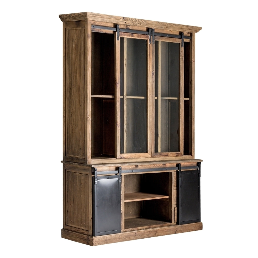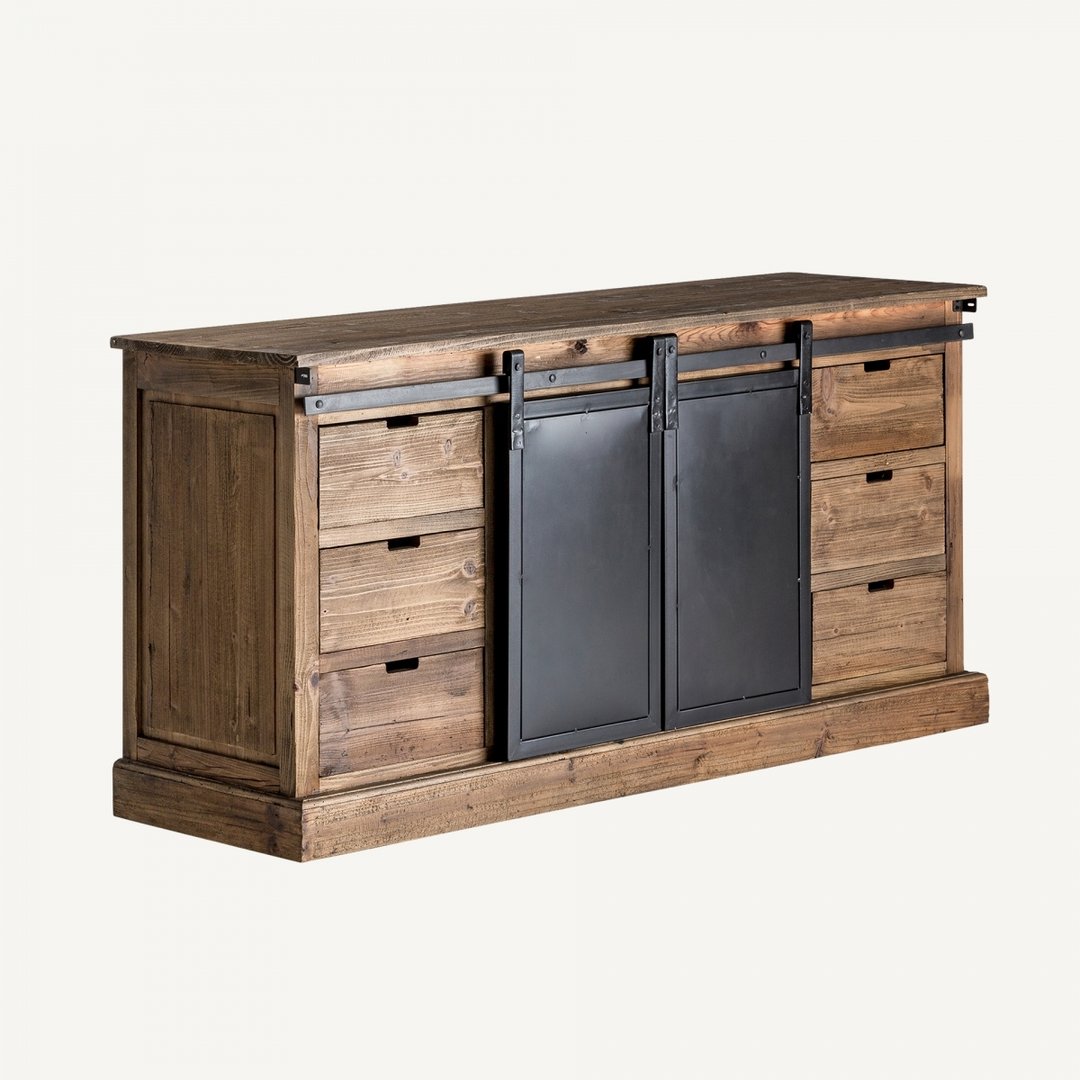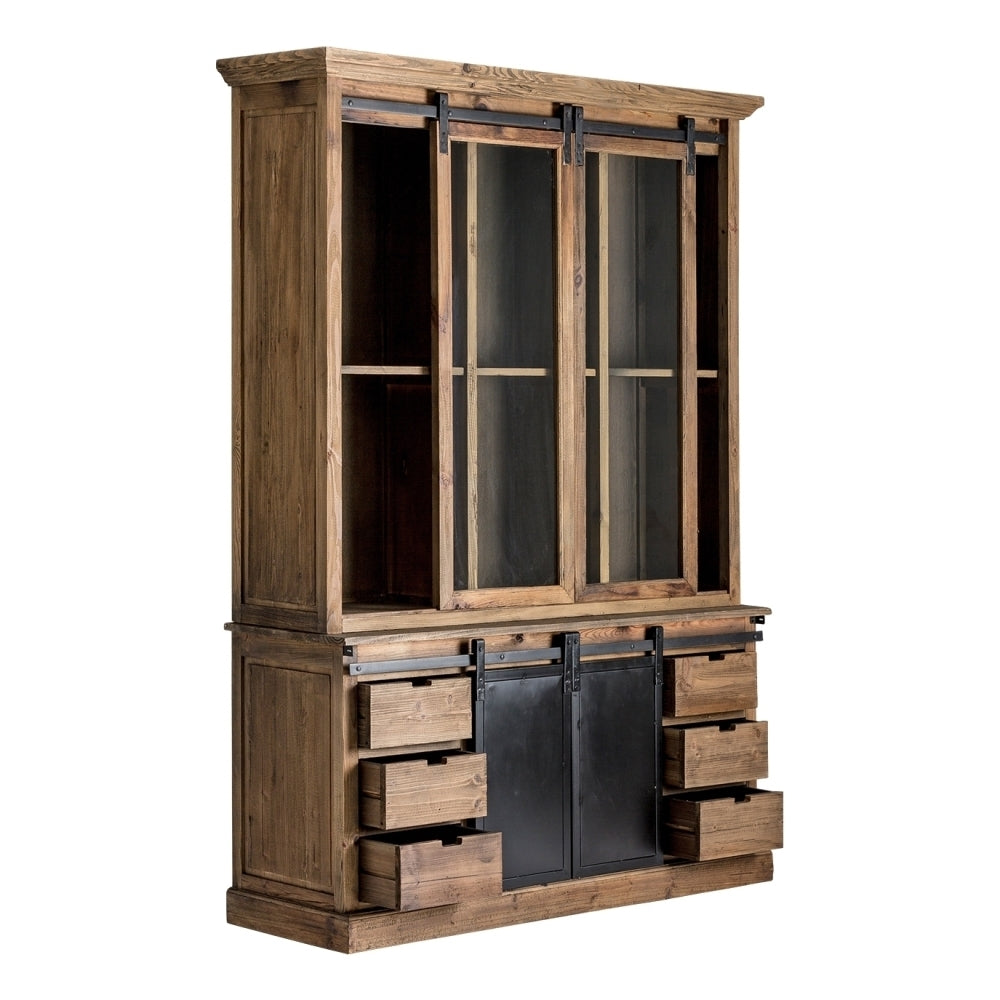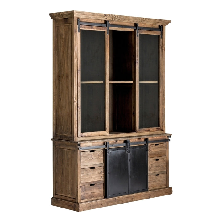 L'alzata della vetrina è realizzata anch'essa in legno di pino riciclato, con dimensioni di 168 x 45 x 160 cm e un peso di 61,7 kg. Le due porte scorrevoli conducono a 3 ampi spazi interni, ciascuno di misura 51 x 34,5 x 136 cm. Ci sono tre ripiani fissi con un'altezza di 68 cm tra di loro. Le porte scorrevoli offrono un facile accesso e aggiungono un tocco di stile industriale alla vetrina.