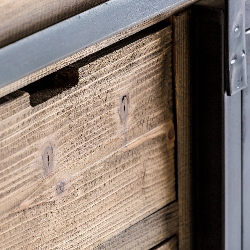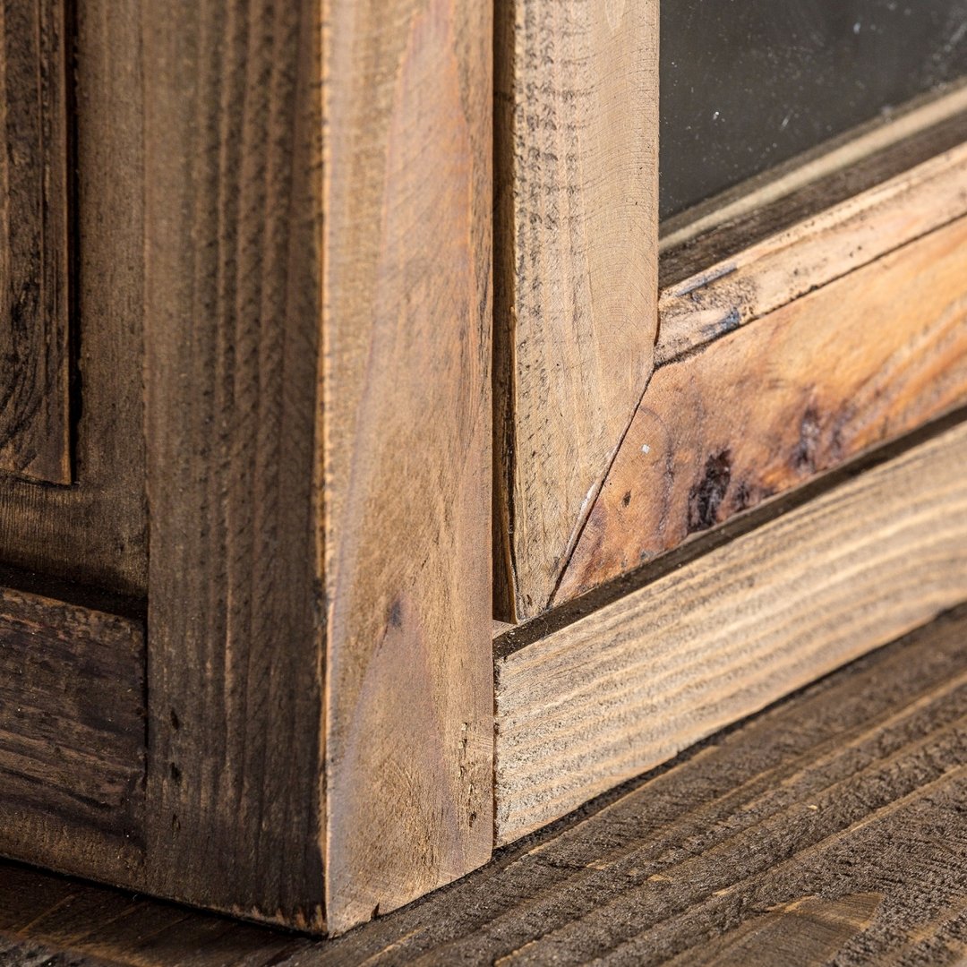 Questa vetrina stile industriale è realizzata con legno di pino riciclato, conferendo al mobile un aspetto rustico e caratteristico. Grazie alla sua fabbricazione artigianale, comprendiamo che le variazioni di tonalità e le imperfezioni come crepe, nodi e marchi aggiungono valore e rendono ogni pezzo unico.