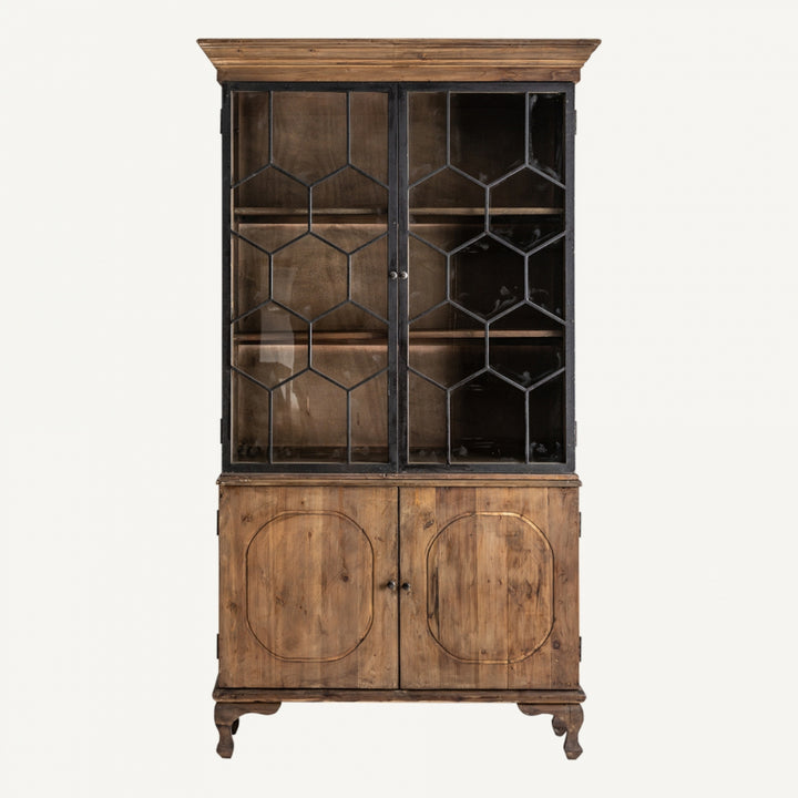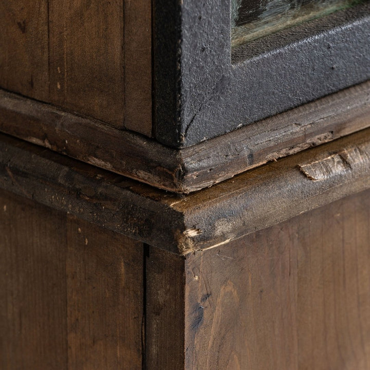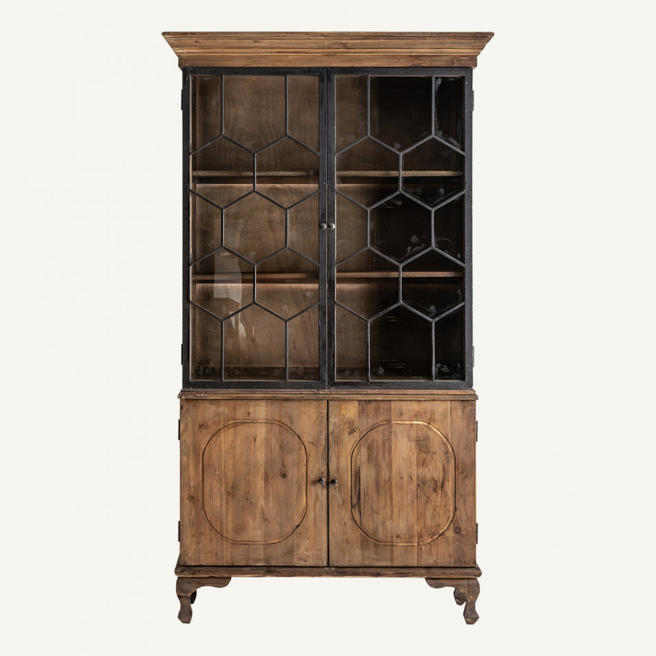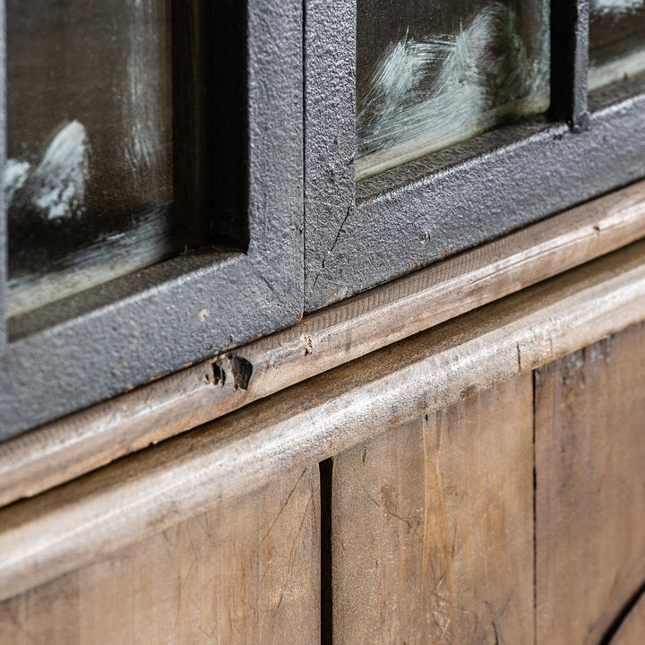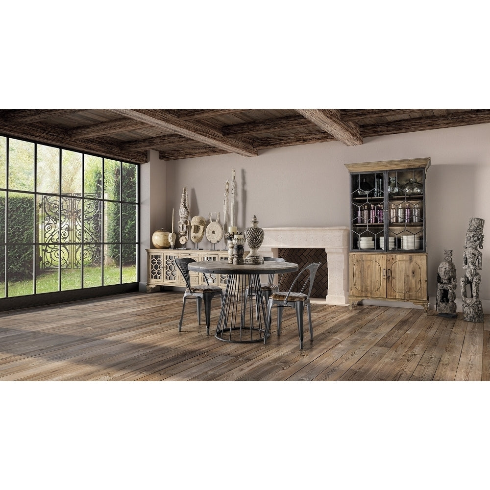 Il materiale utilizzato per la vetrina è il legno di pino riciclato, combinato con elementi in ferro. Questa combinazione di materiali conferisce al pezzo un aspetto robusto e industriale, mentre il legno di pino riciclato aggiunge un tocco di calore e carattere.