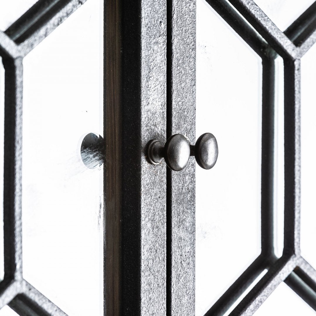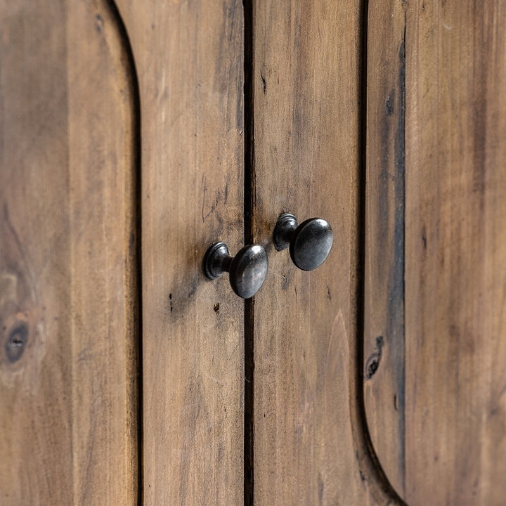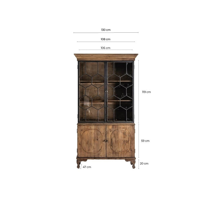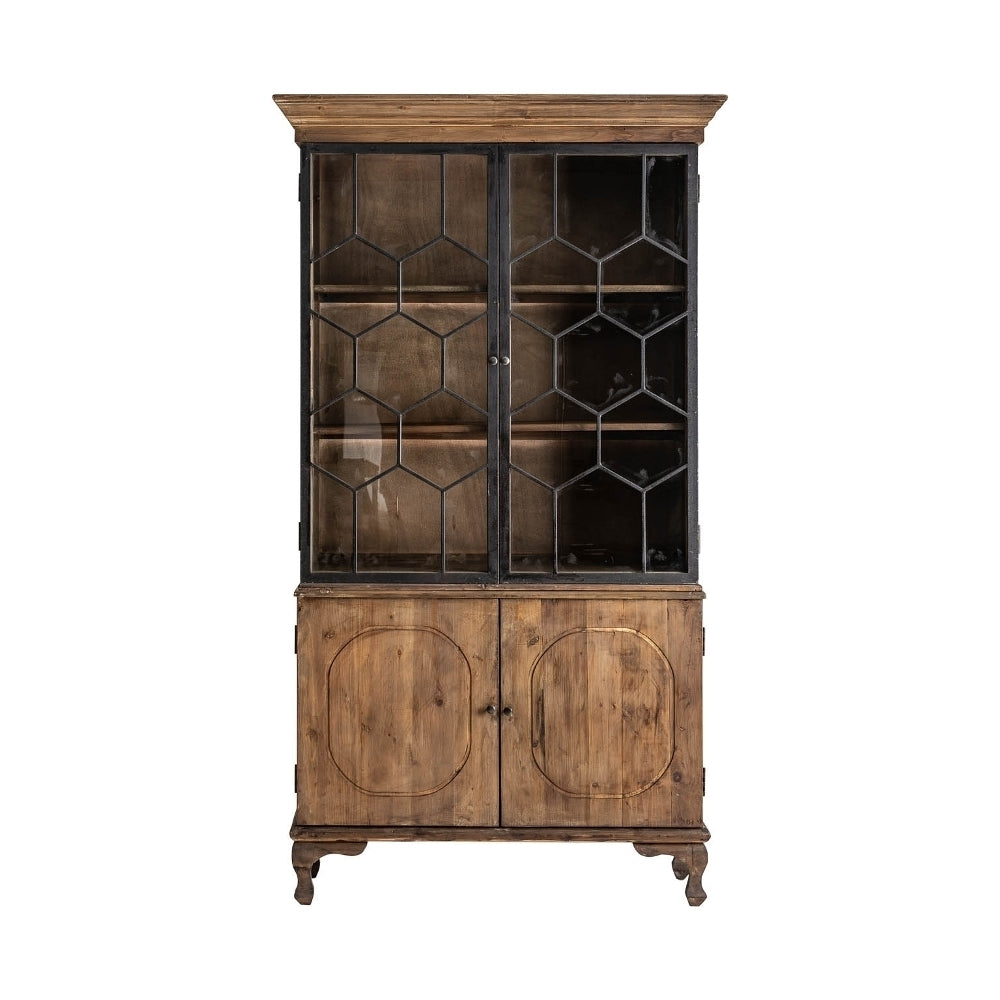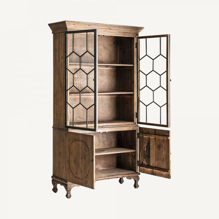 Il materiale utilizzato per la vetrina è il legno di pino riciclato, combinato con elementi in ferro. Questa combinazione di materiali conferisce al pezzo un aspetto robusto e industriale, mentre il legno di pino riciclato aggiunge un tocco di calore e carattere.