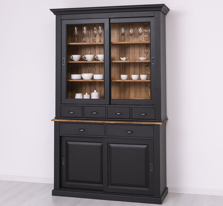 Lo stile country noir rappresenta l’incontro perfetto tra eleganza e carattere, con tonalità scure che donano profondità e raffinatezza agli ambienti. La Vetrina Libreria Country Noir è realizzata interamente in legno massello al 100%, con una finitura nero opaco che aggiunge un tocco sofisticato e moderno. La parte superiore è dotata di 2 ante scorrevoli in vetro, ideali per esporre libri, piatti o collezioni, mentre la parte inferiore presenta cassetti e ante scorrevoli in legno per una pratica organizzazione dello spazio. Facile da pulire con un panno umido, unisce design e funzionalità in un mobile di grande impatto visivo. Perfetta per soggiorni, cucine o studi, garantisce durata e qualità artigianale con sconti fino al 70% su Ethnic Chic.