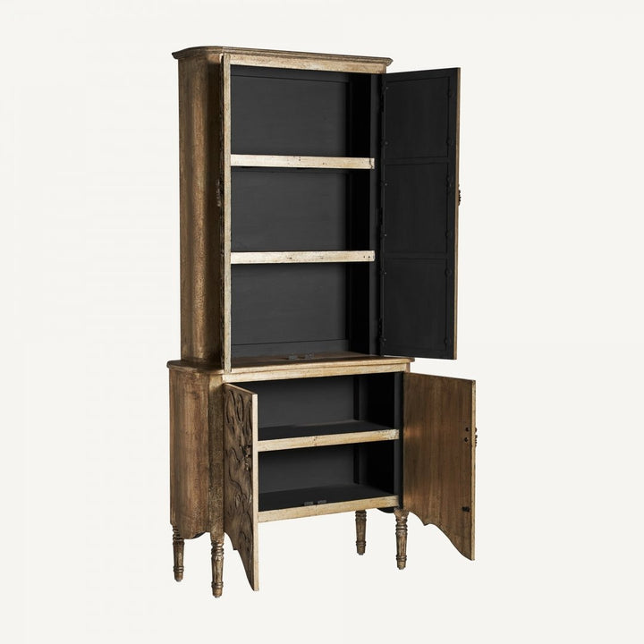 La vetrina è composta da una combinazione di materiali che includono il legno di mango, il vetro e il ferro. Questa combinazione conferisce al mobile un aspetto elegante e industriale.